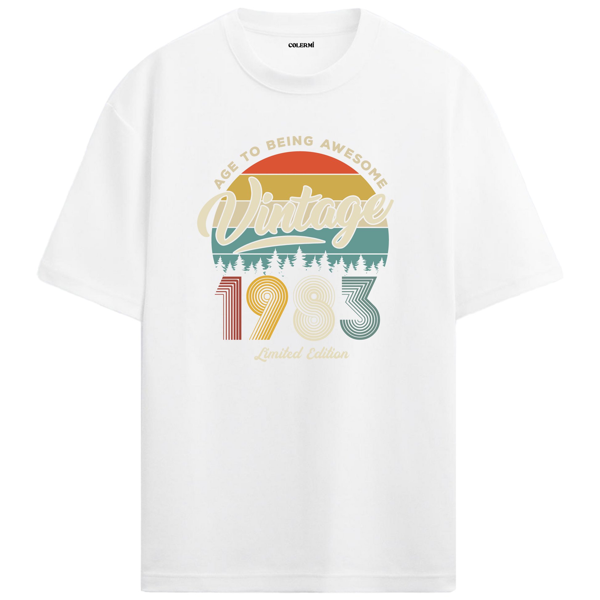 1983 Nostalgia Oversized T-Shirt - Retro Typography & Nature Silhouette Design
