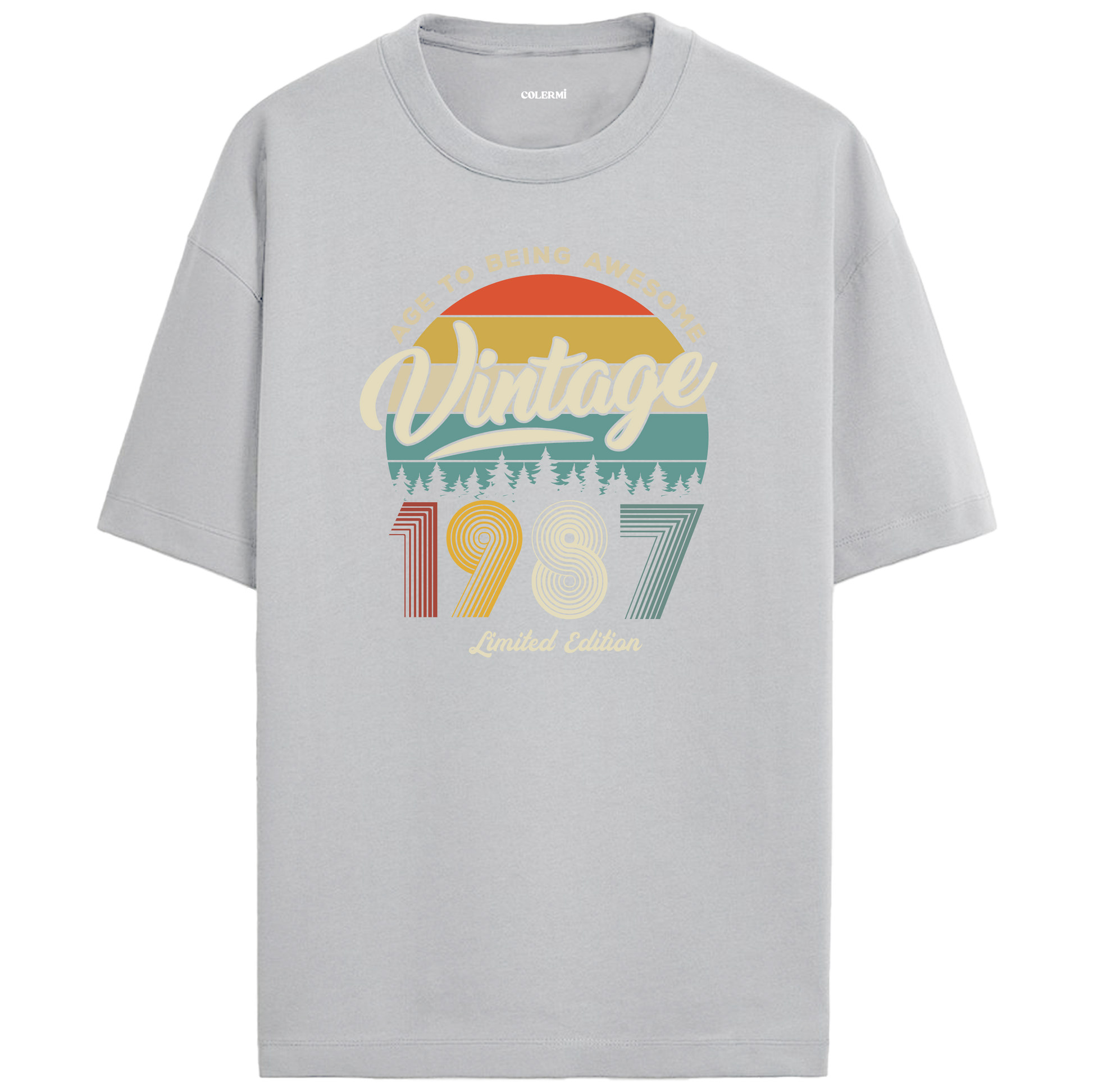 1987 Nostalgia Oversized T-Shirt - Retro Sunset Pine Tree Design