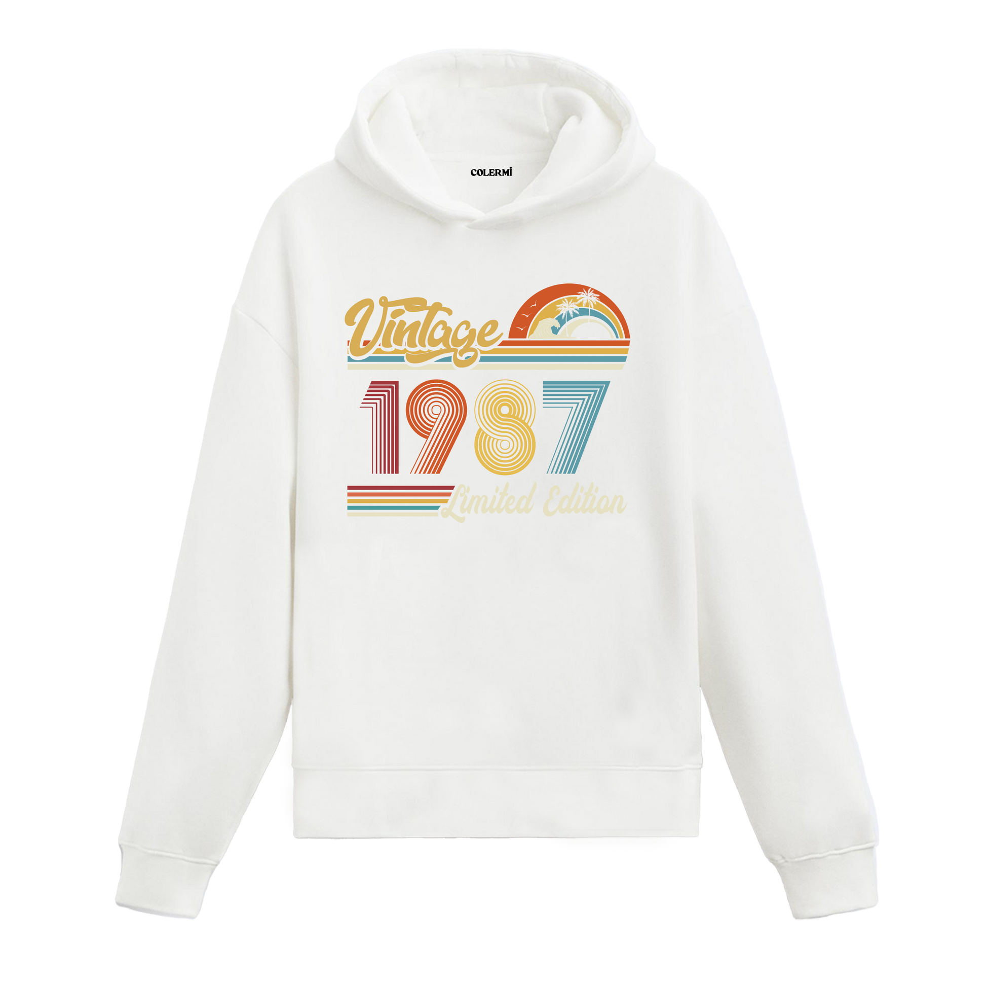 1987 doğum tarihli retro baskılı siyah vintage hoodie