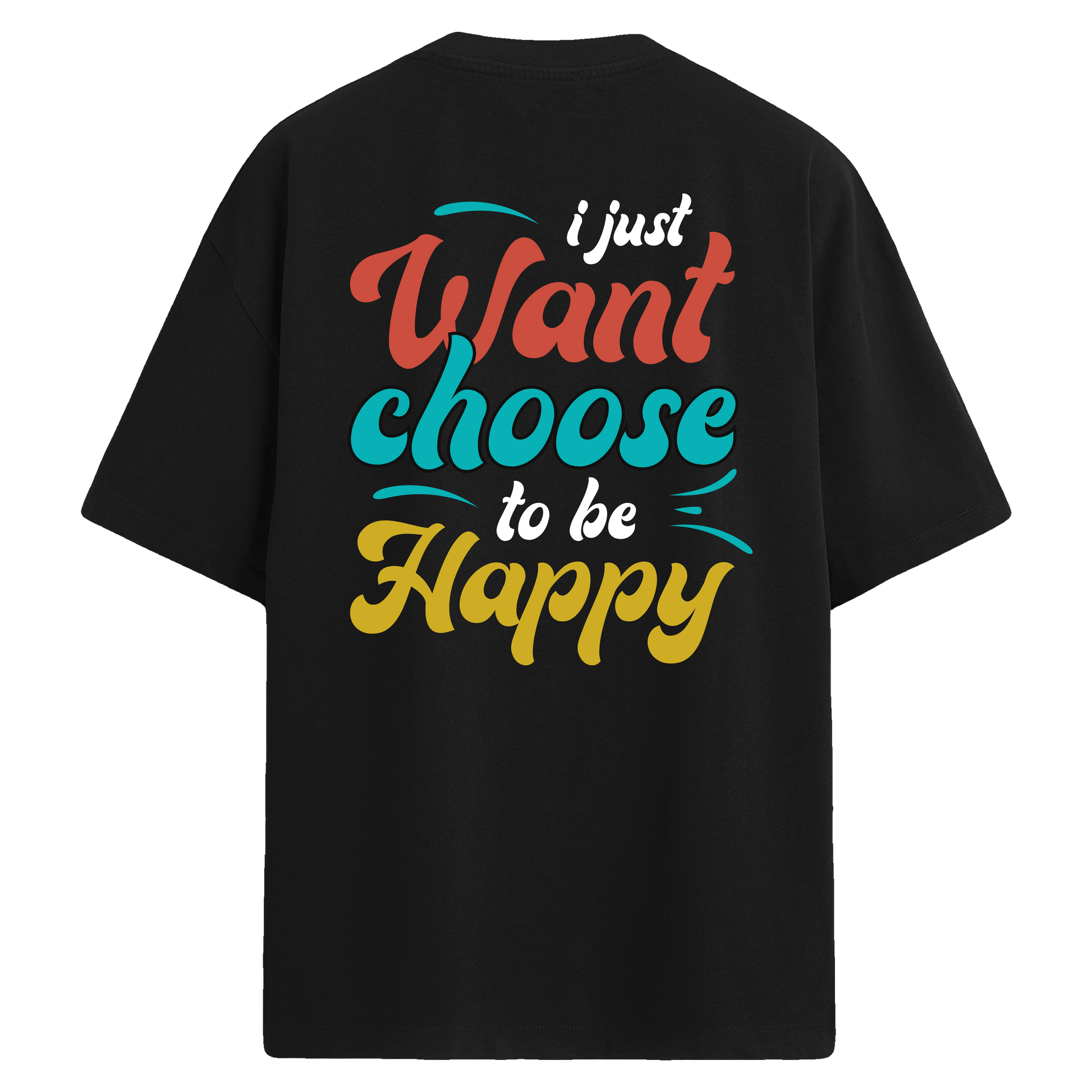 Sırt kısmında “I Just Want Choose to Be Happy” yazısıyla pozitif enerji yayan bu oversize unisex t-shirt, canlı renkli tipografisiyle dikkat çekiyor.