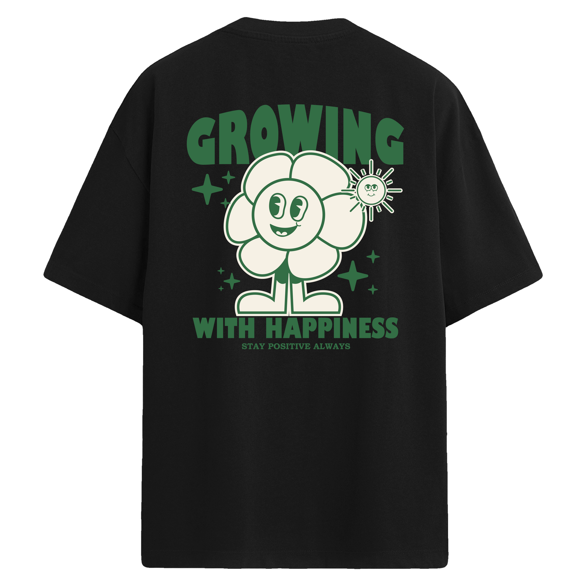 “Growing With Happiness” tişörtü, neşeli çiçek karakteri ve minimal güneş illüstrasyonuyla gülümseten bir yaz parçası.