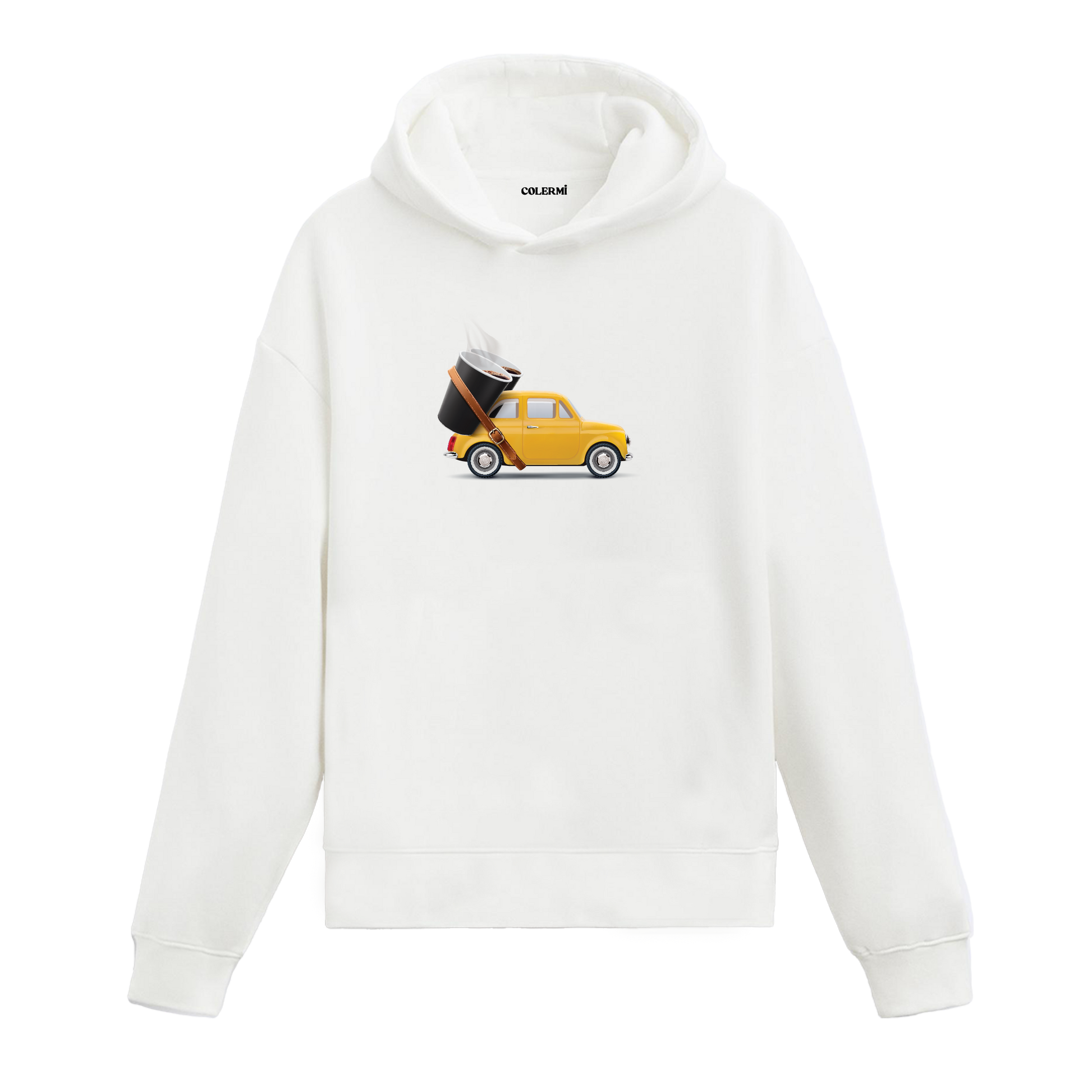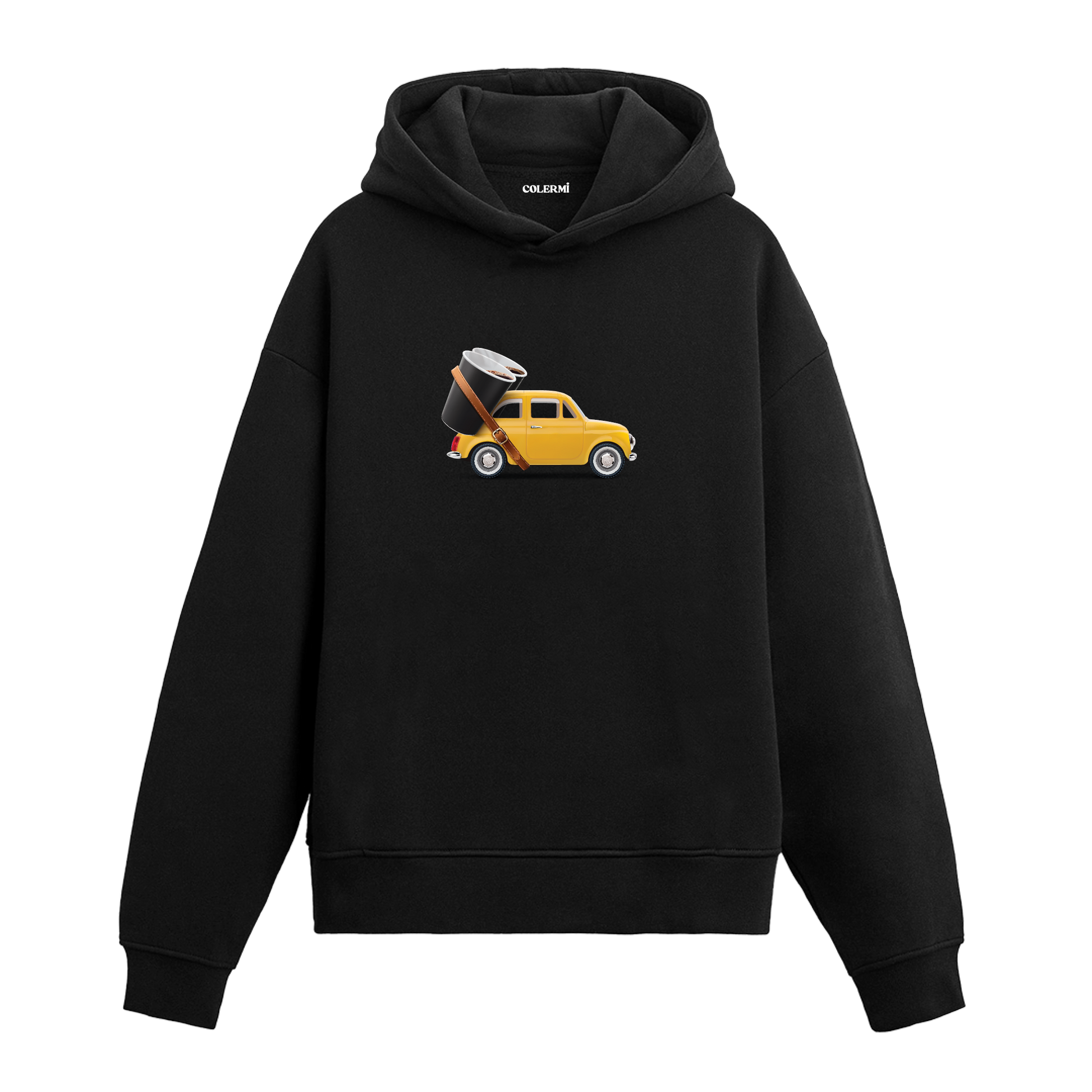 Göğüs bölümünde arkasında büyük bir kahve fincanı taşıyan klasik araç baskısı yer alır. Dengeli kalıbı ve tok dokusuyla günlük kullanımda sakin bir rahatlık sunar. Mizahı yüksek sesle değil, detayla kuran bir parçadır.