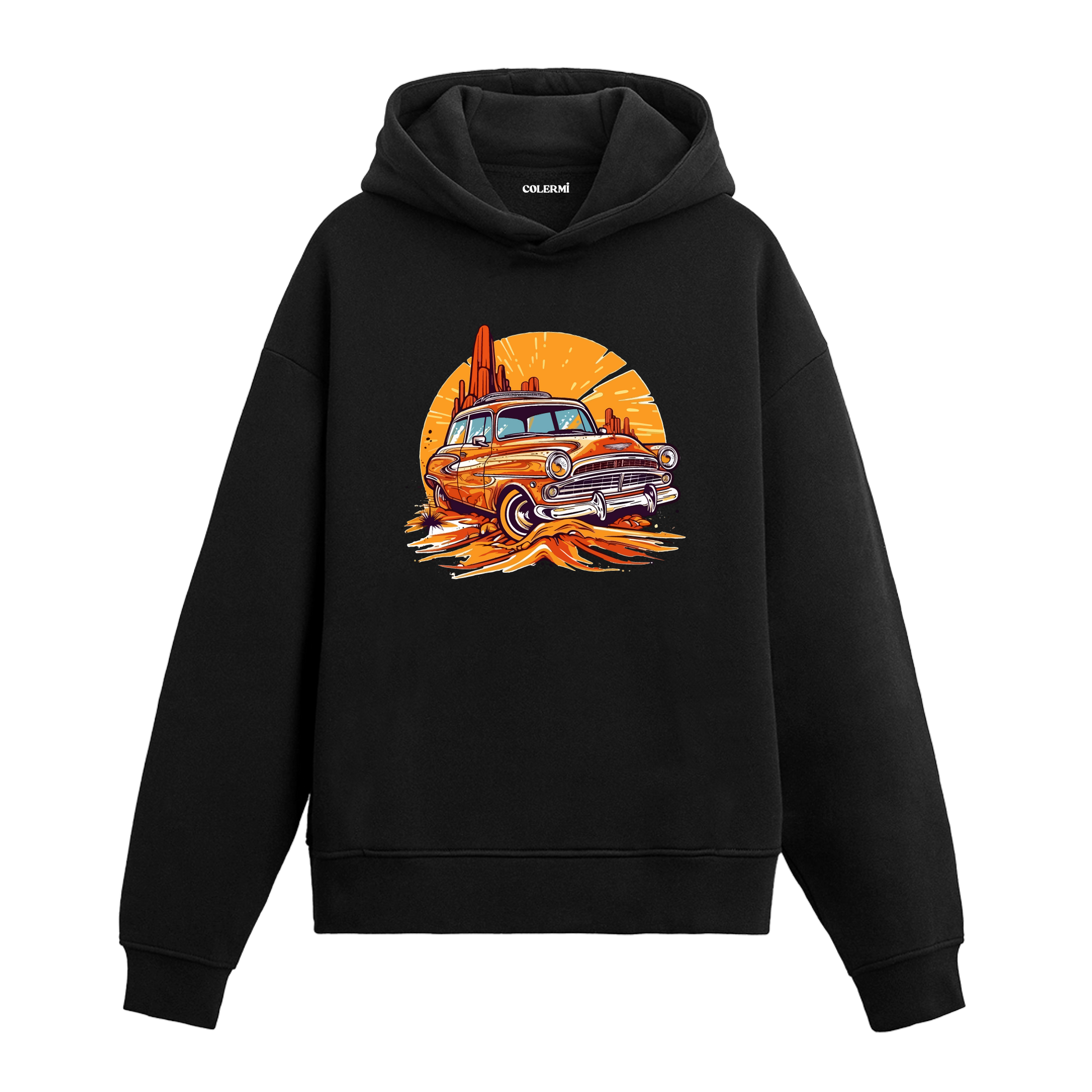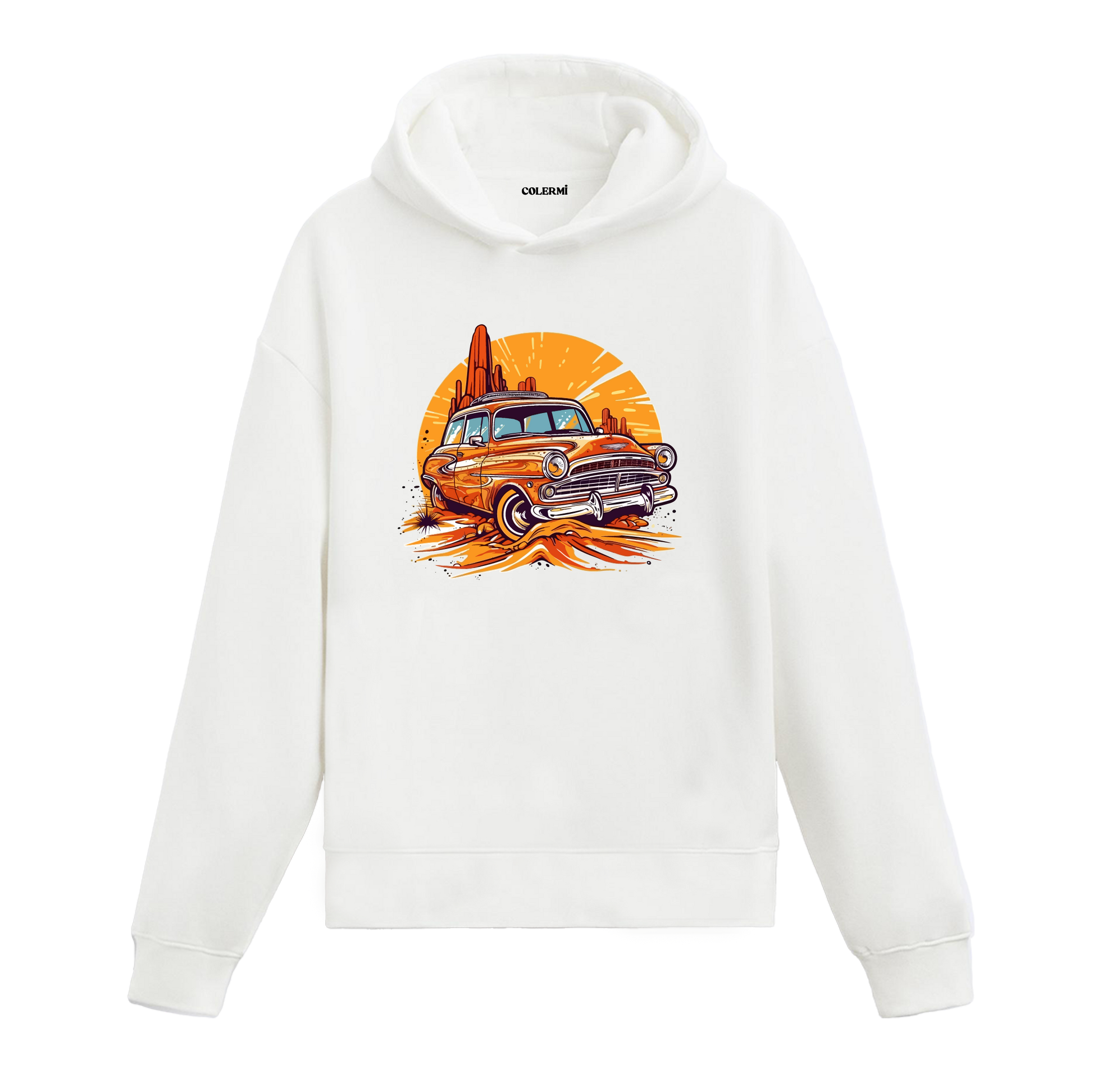 Göğüs bölümünde çöl zemininde ilerleyen klasik araç baskısı yer alır. Dengeli kalıbı ve tok dokusuyla günlük kullanımda rahat ve net bir duruş sunar. Hareket hissini hızdan değil, akıştan alan bir parçadır.