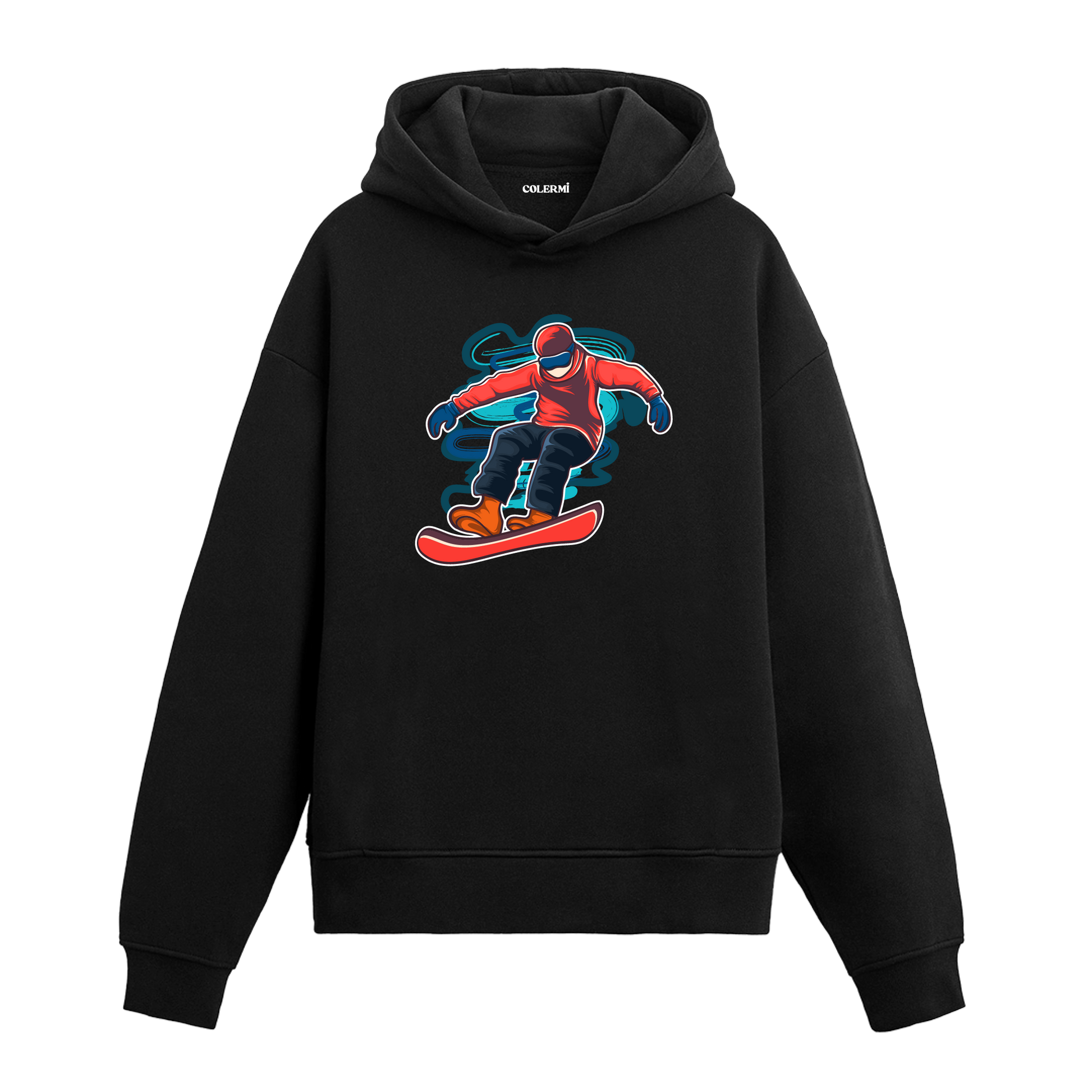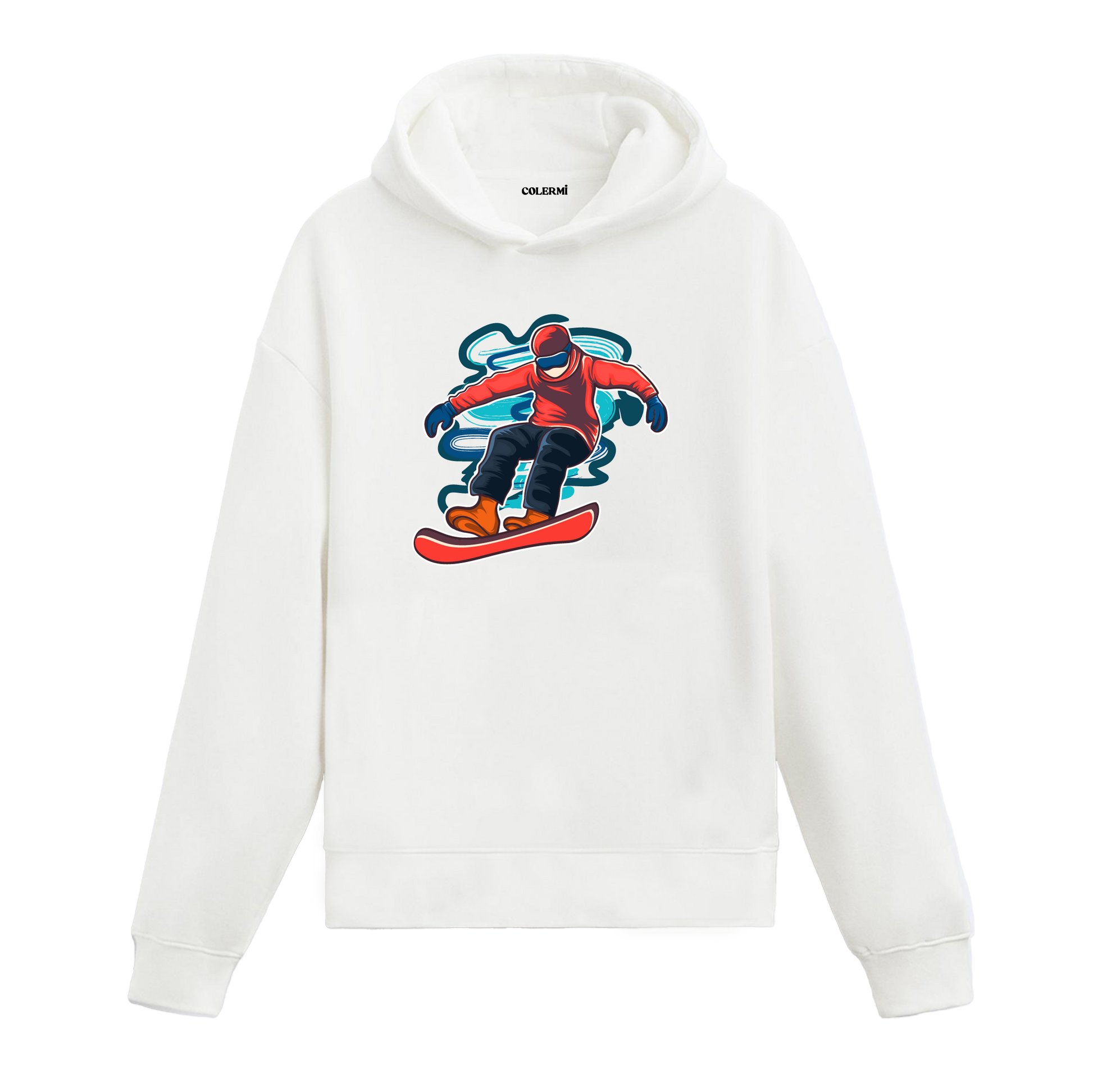 Göğüs bölümünde havada süzülen snowboard baskısı yer alır. Dengeli kalıbı ve tok dokusuyla hareketi kısıtlamayan bir kullanım sunar. Hızı değil akışı önemseyen, sessiz bir denge hissi taşır.