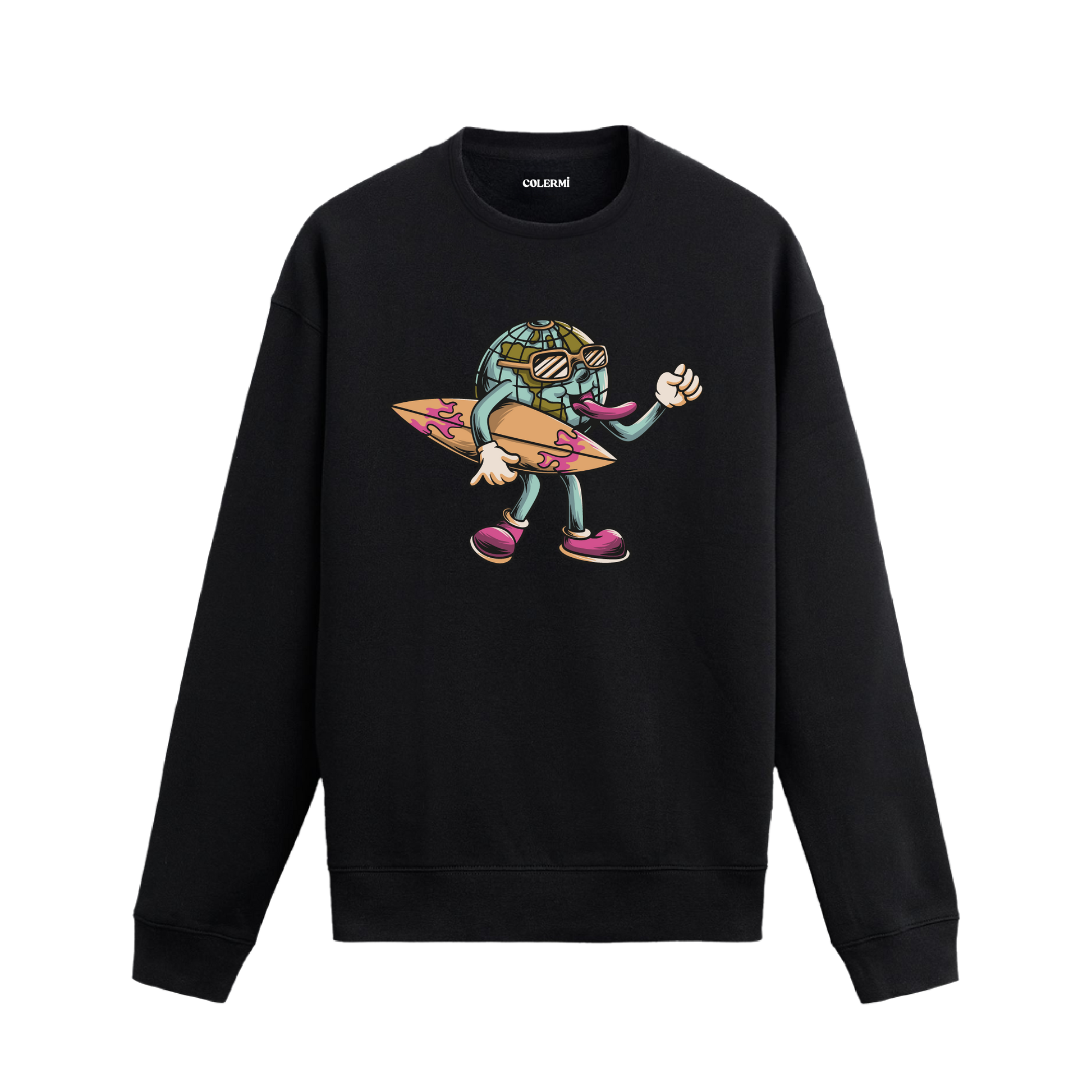 Göğüs bölümünde sörf tahtası taşıyan, stilize edilmiş dünya karakteri baskısı yer alır. Dengeli kalıbı ve tok dokusuyla günlük kullanımda rahat bir his sunar. Hareketi ciddiye almadan sahiplenen, enerjisi hafif bir parçadır.