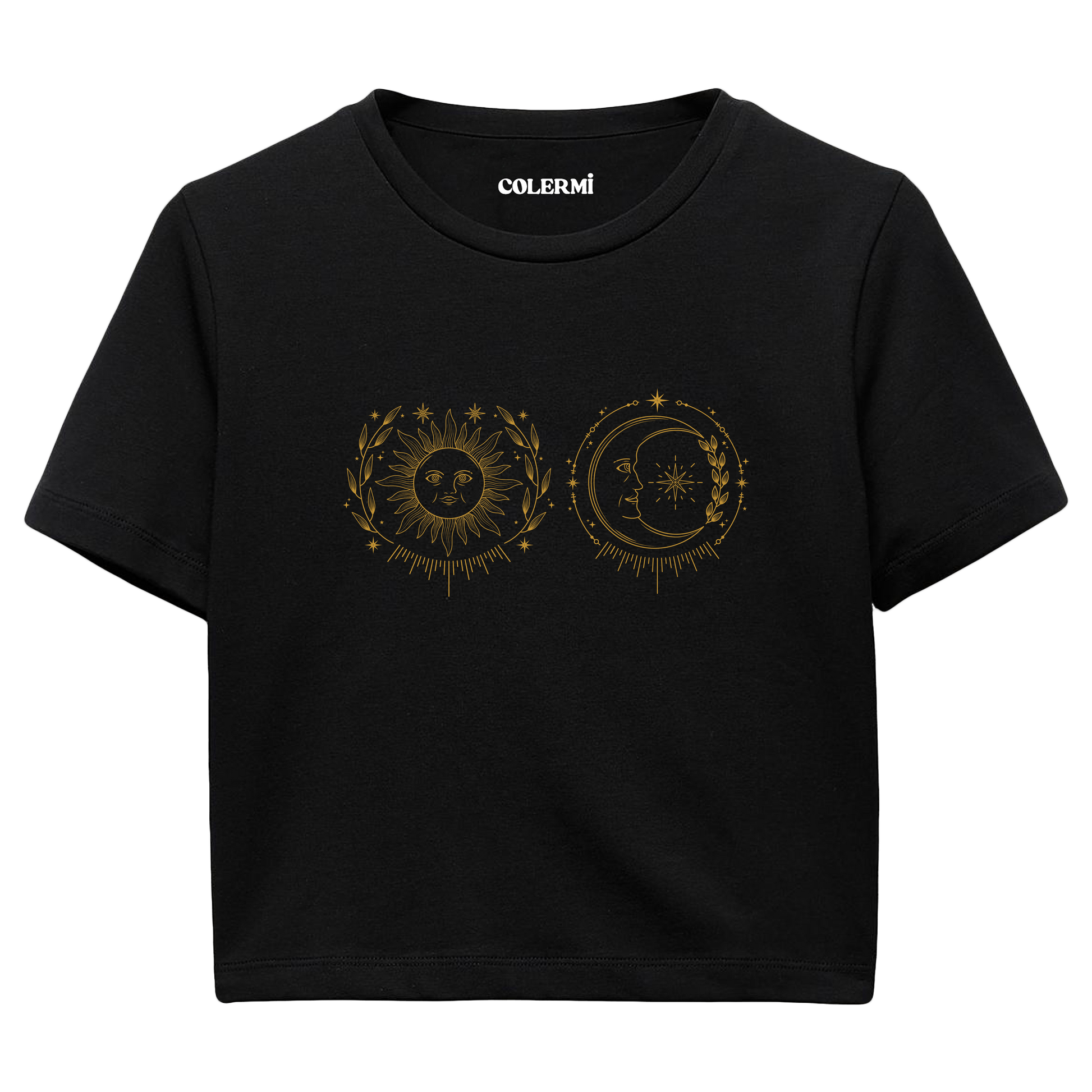 Güneş ve Ay İllüstrasyonlu Crop T-Shirt