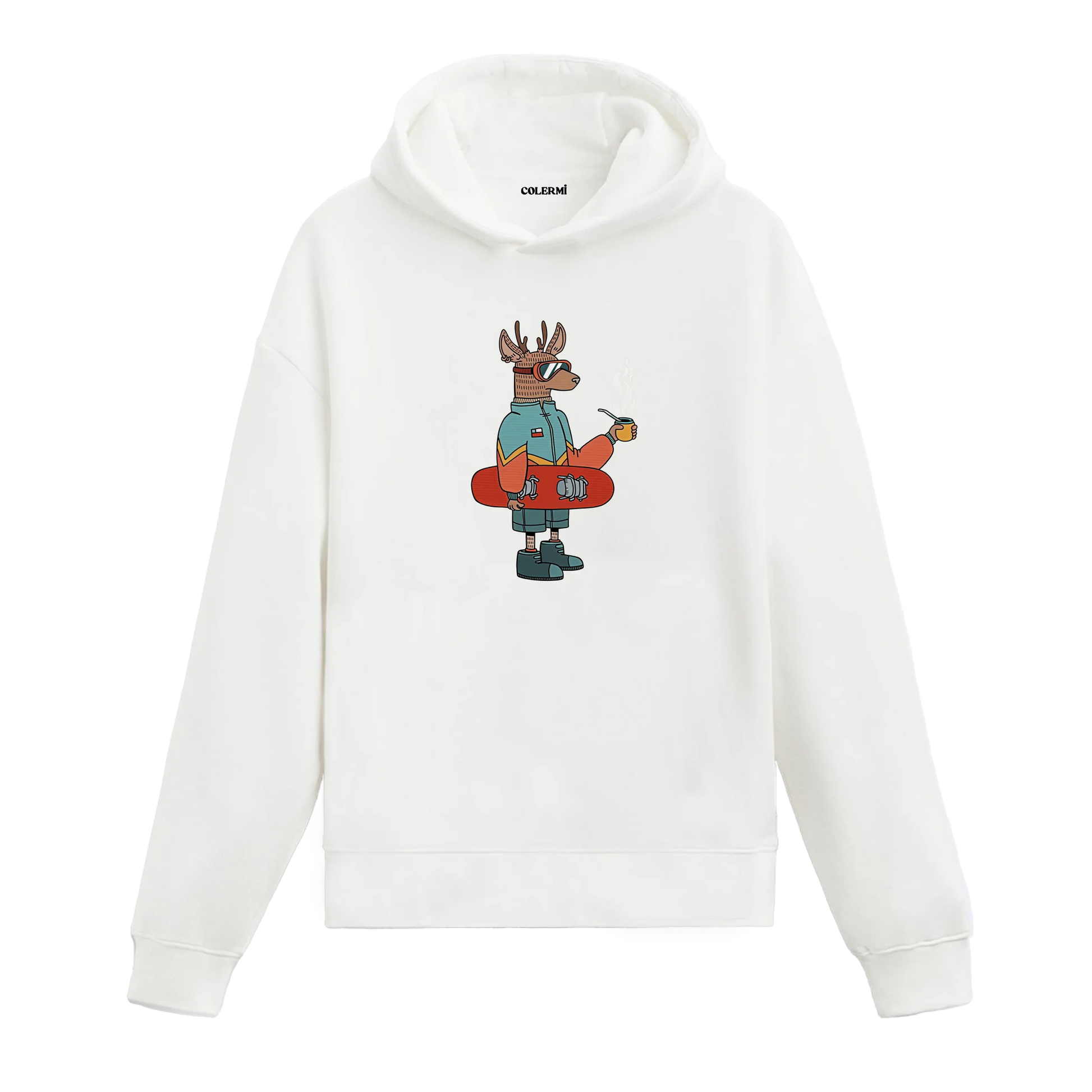Kış temalı snowboardcu geyik tasarımıyla hazırlanan bu hoodie, doğa ve spor hissini sakin bir mizahla birleştirir. Günlük kullanımda rahatlığı ve karakterli bir anlatımı bir arada sunar.