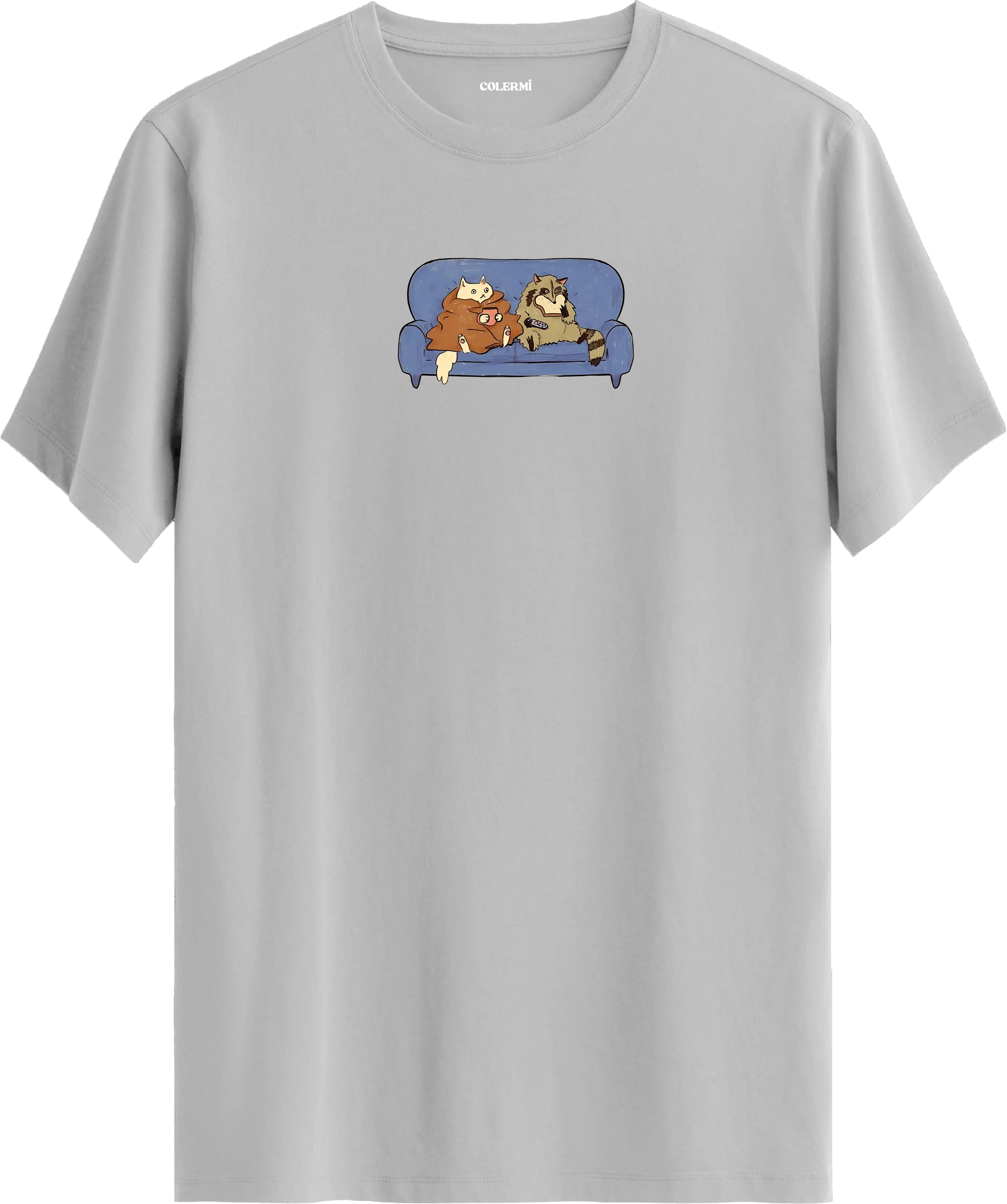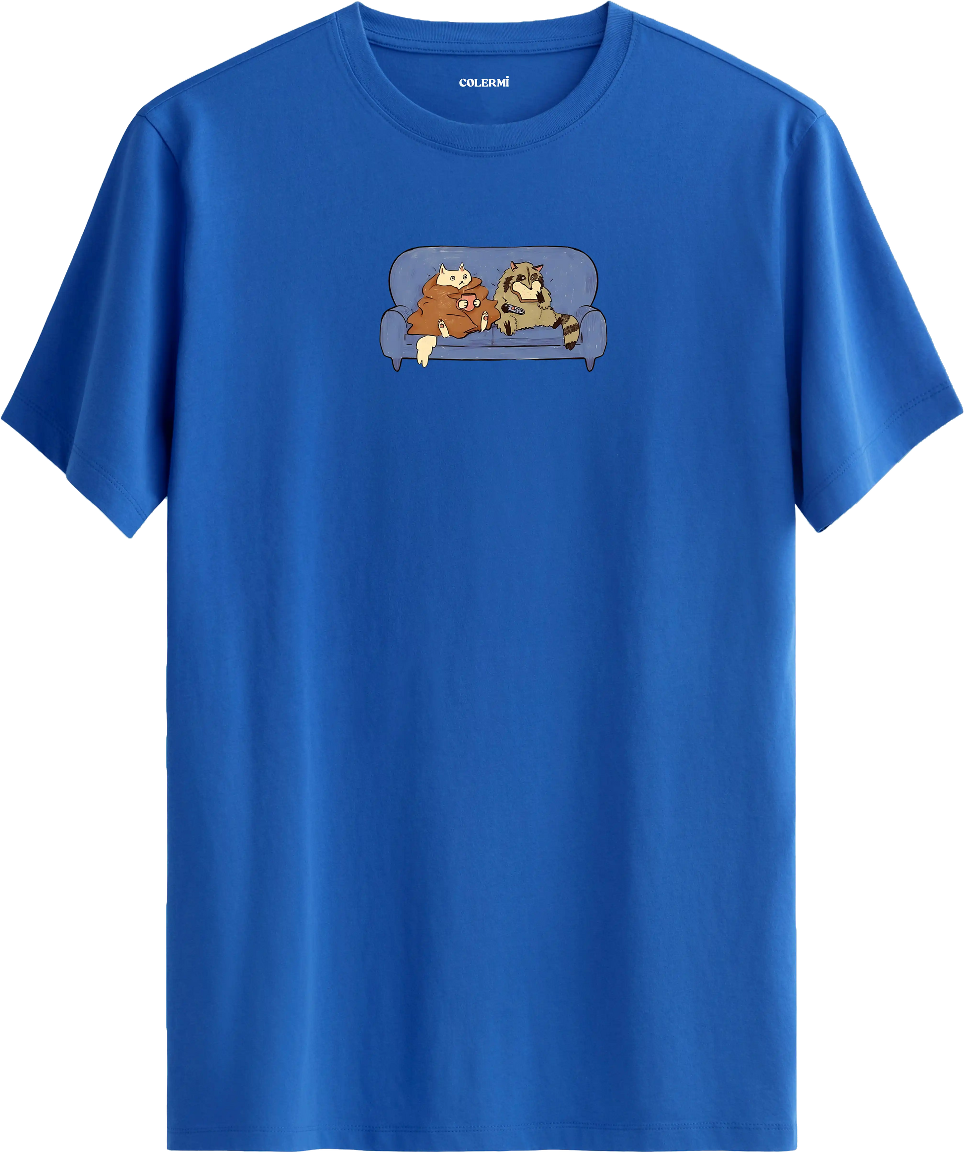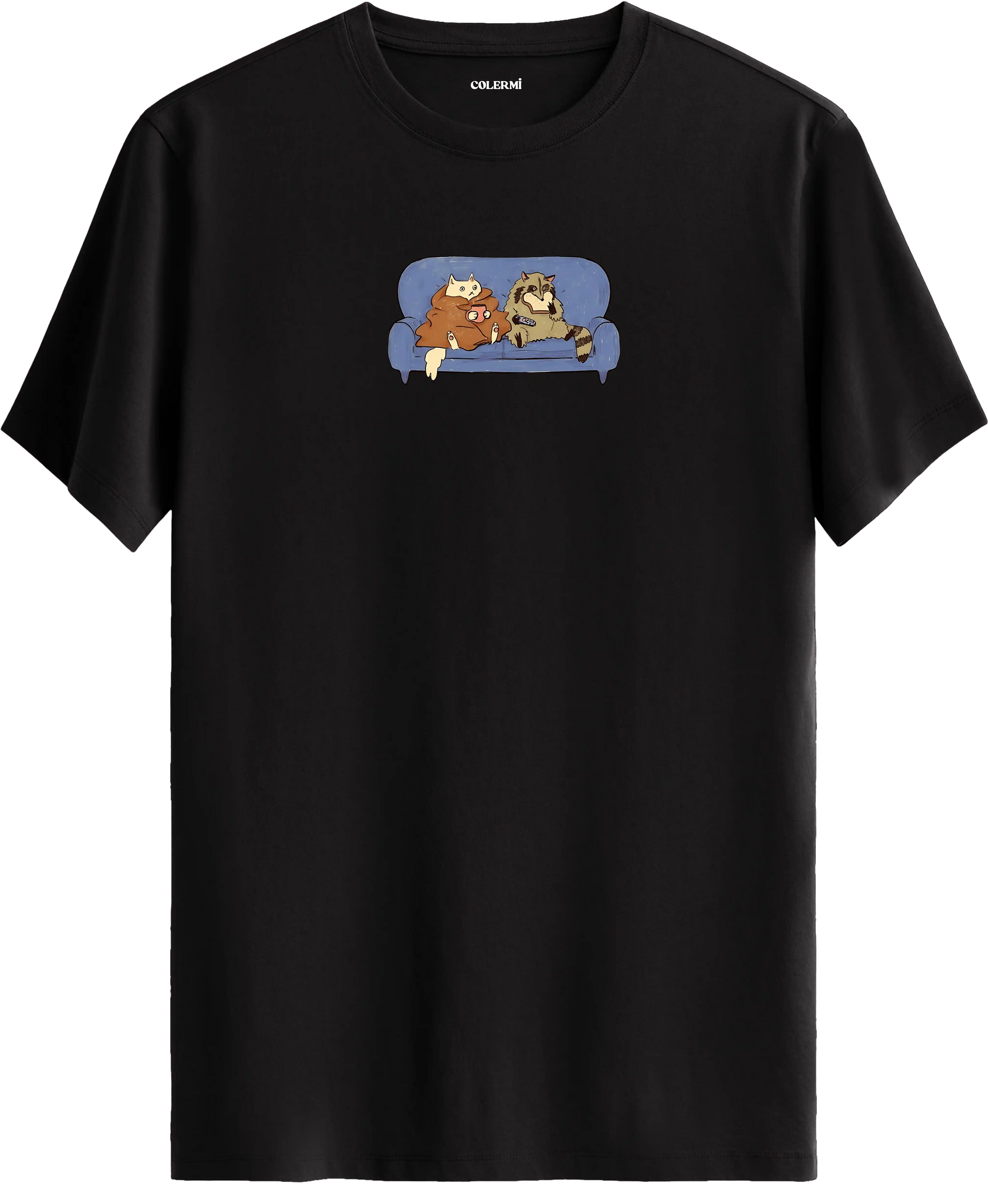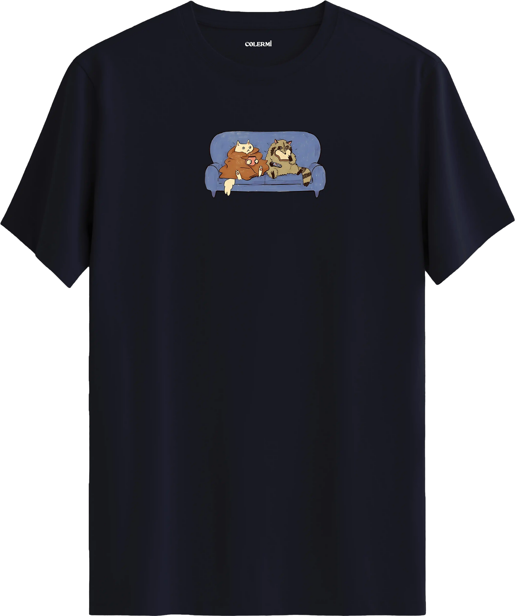 Koltukta keyif yapan kedilerle tasarlanan bu tişört, sıcak ve samimi bir atmosfer yansıtır.