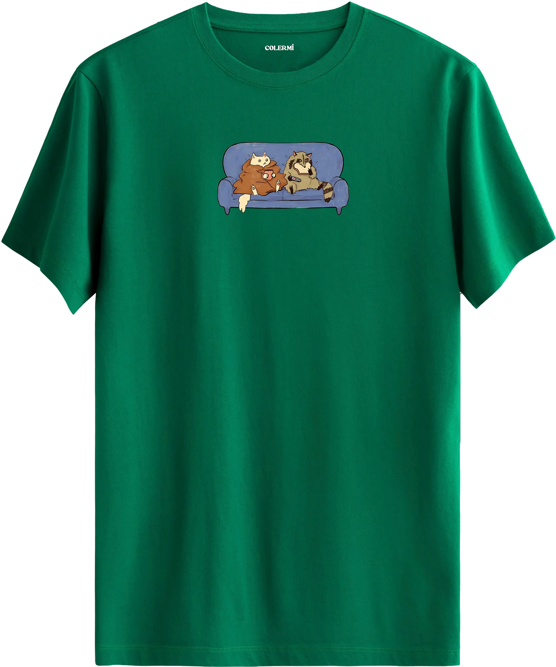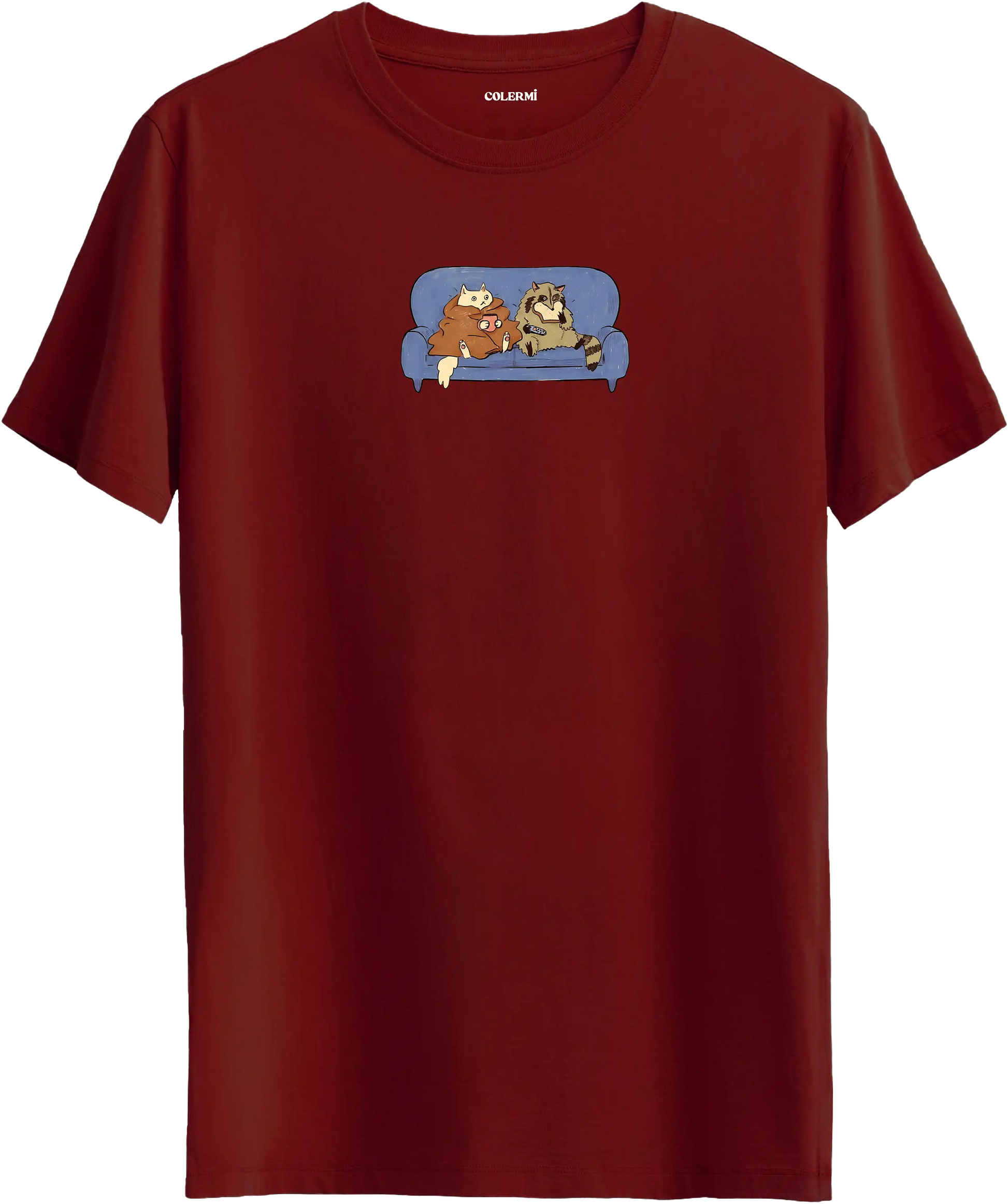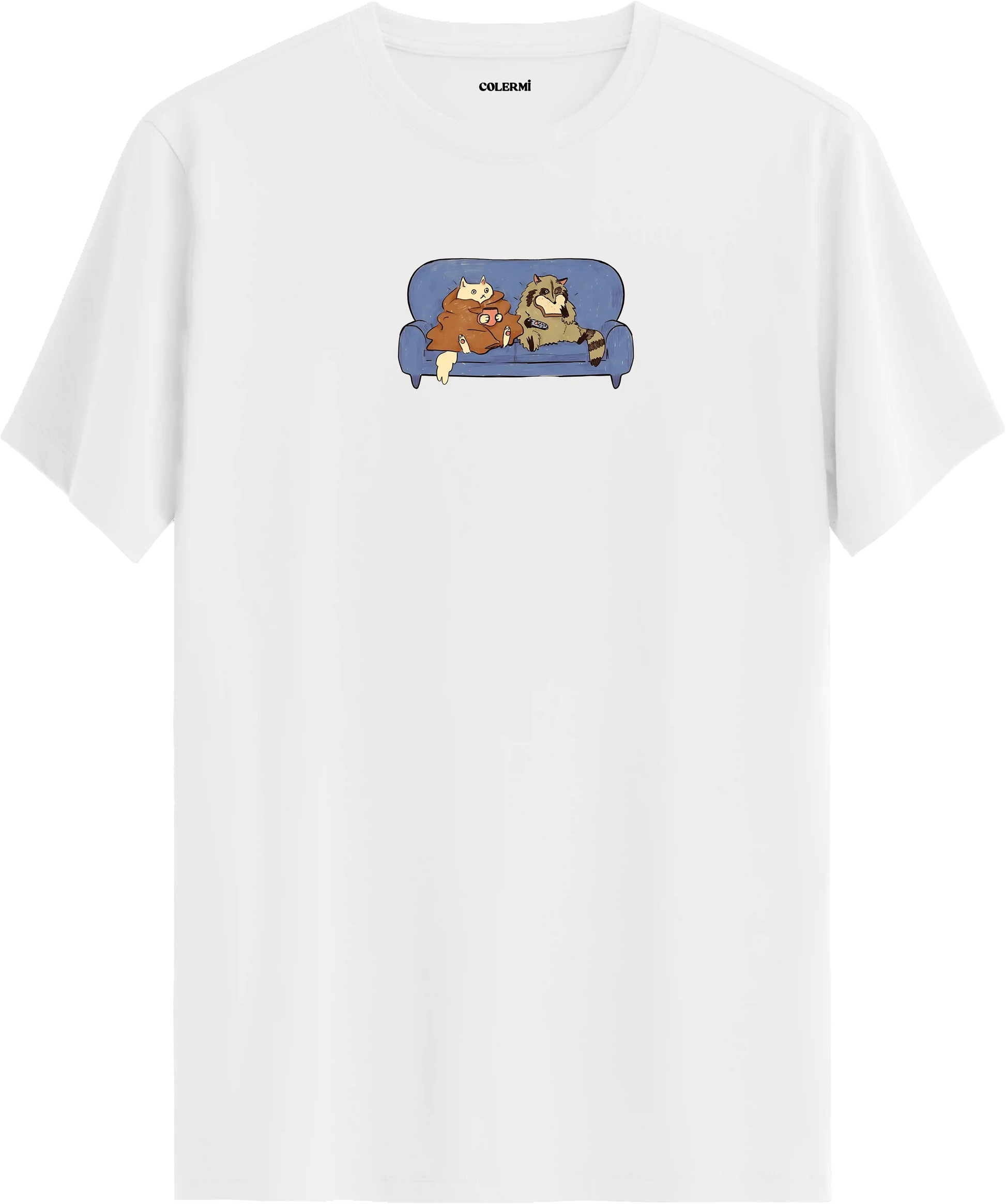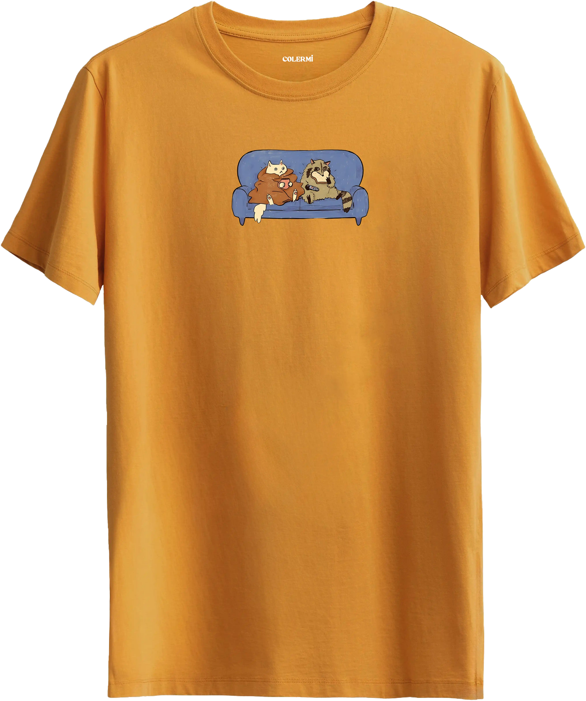 Koltukta keyif yapan kedilerle tasarlanan bu tişört, sıcak ve samimi bir atmosfer yansıtır.
