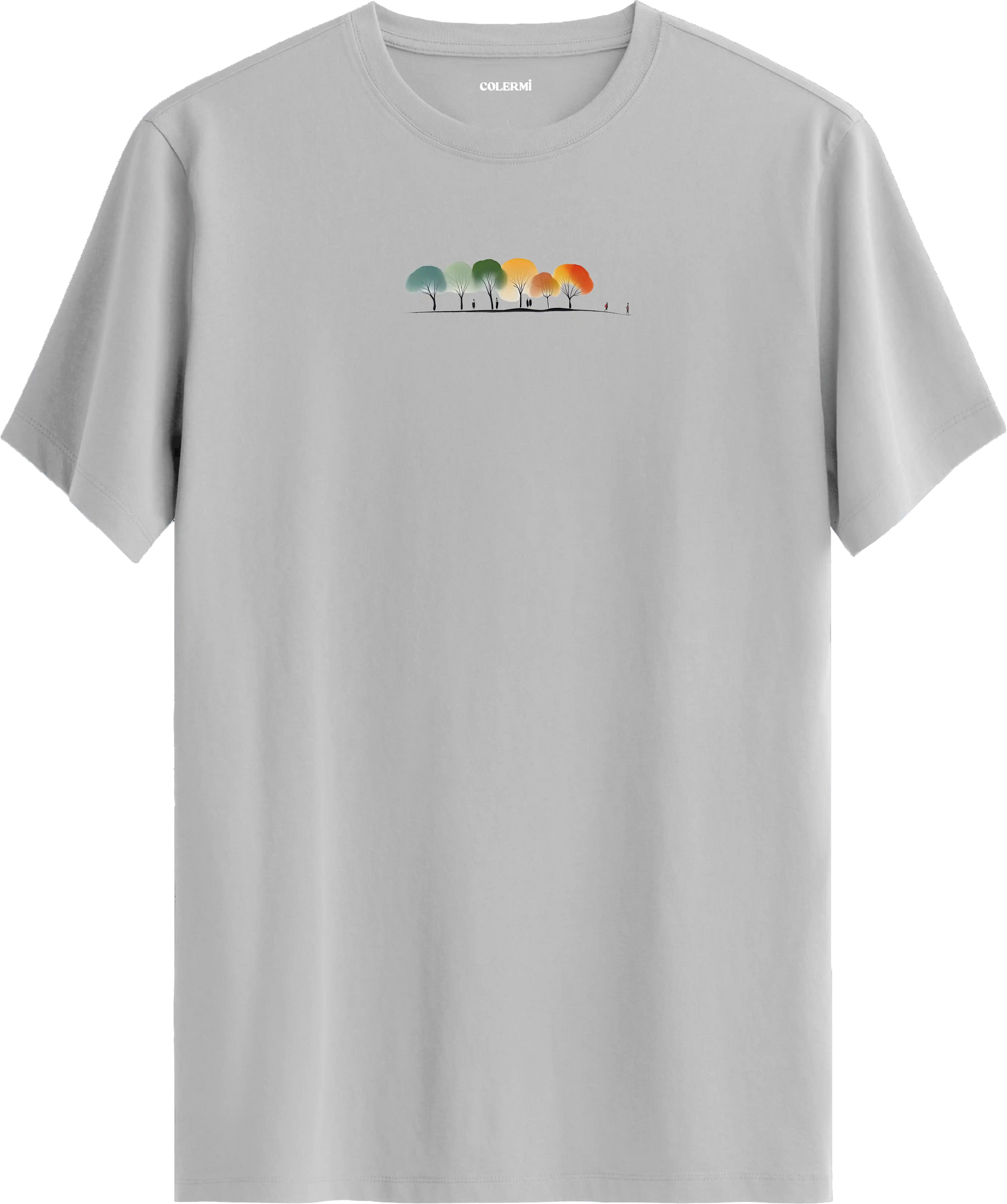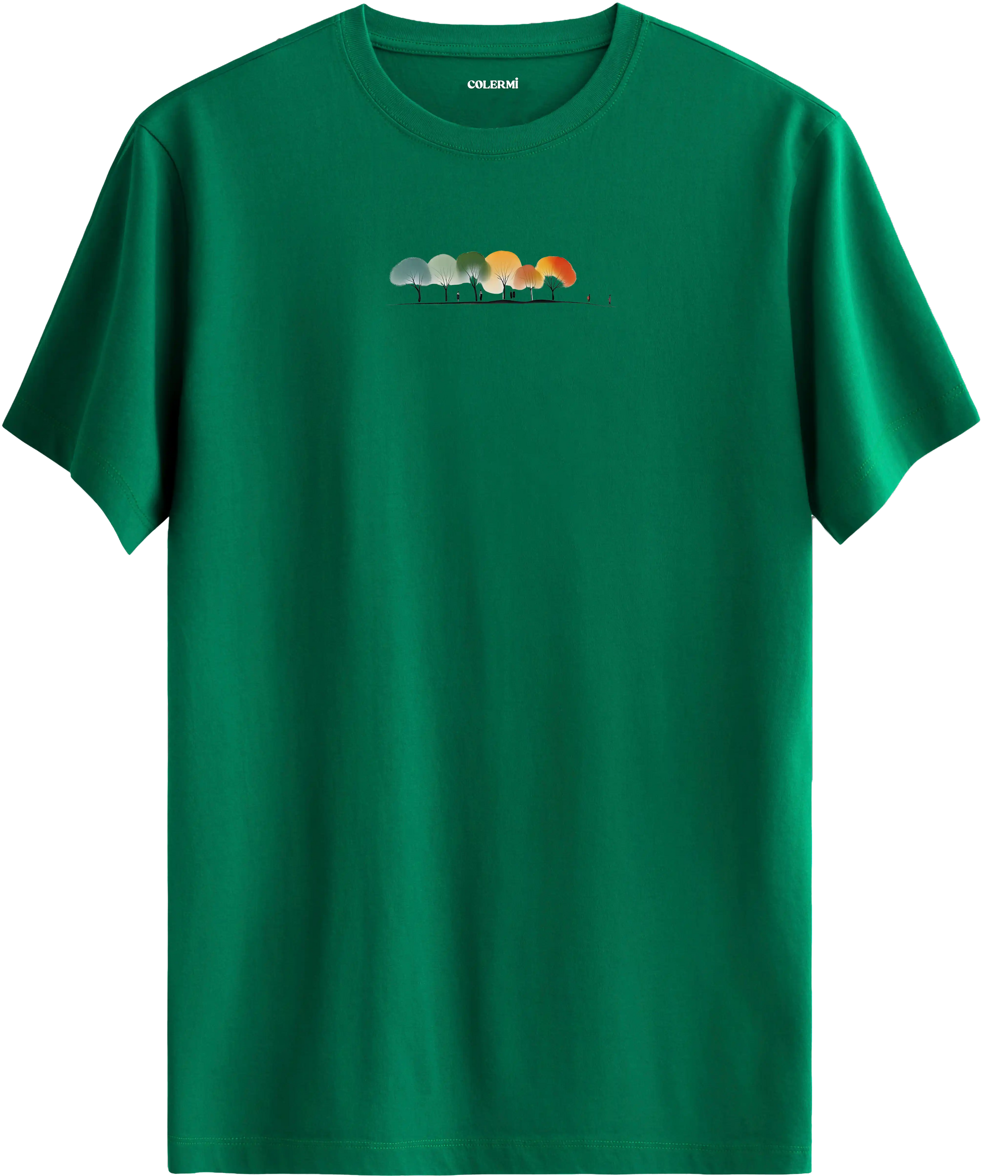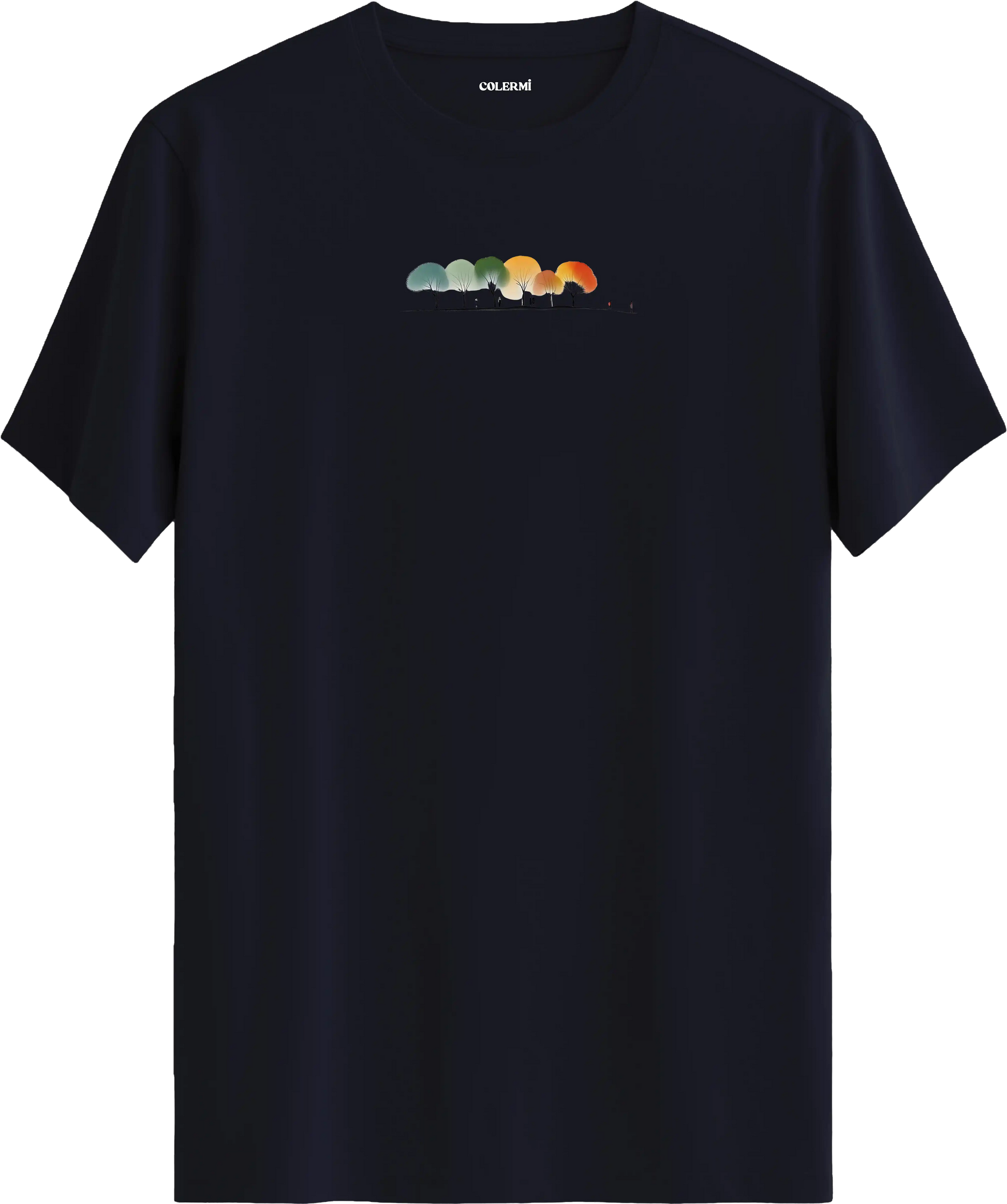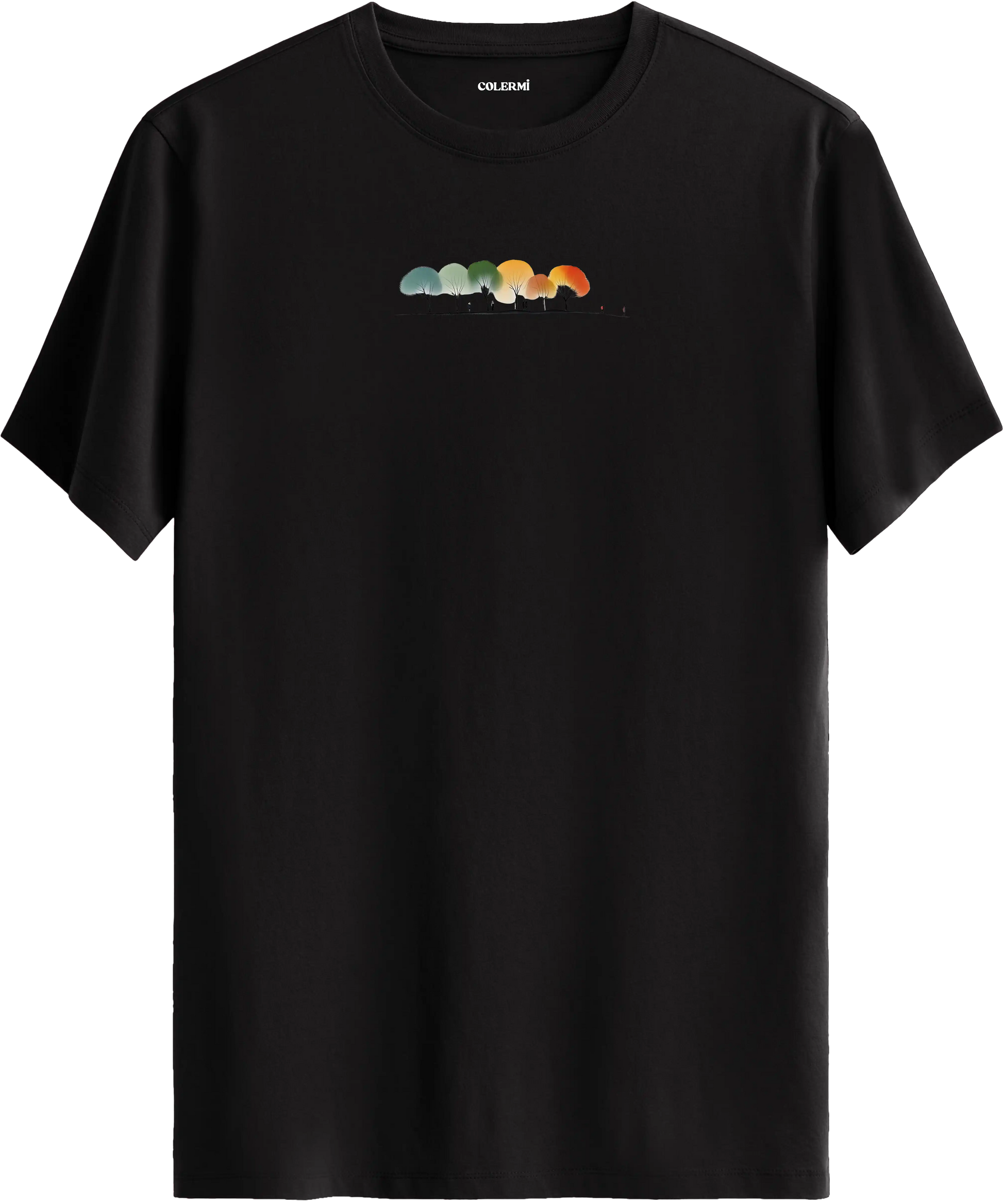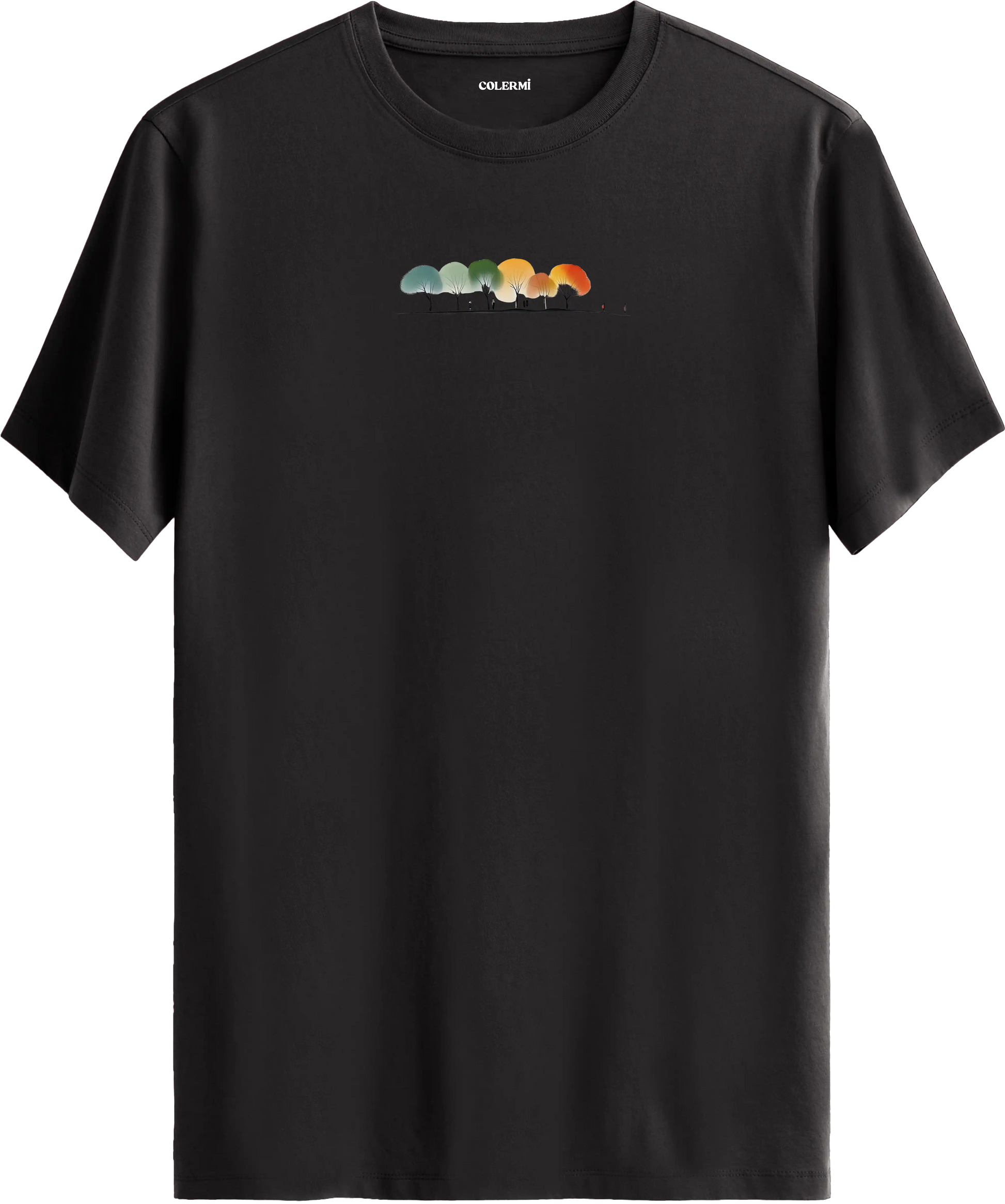 Farklı tonlardaki ağaç siluetleriyle tasarlanan bu tişört, minimal stiline modern bir dokunuş katar. Günlük kombinlerde sade ama dikkat çekici bir görünüm sağlar.