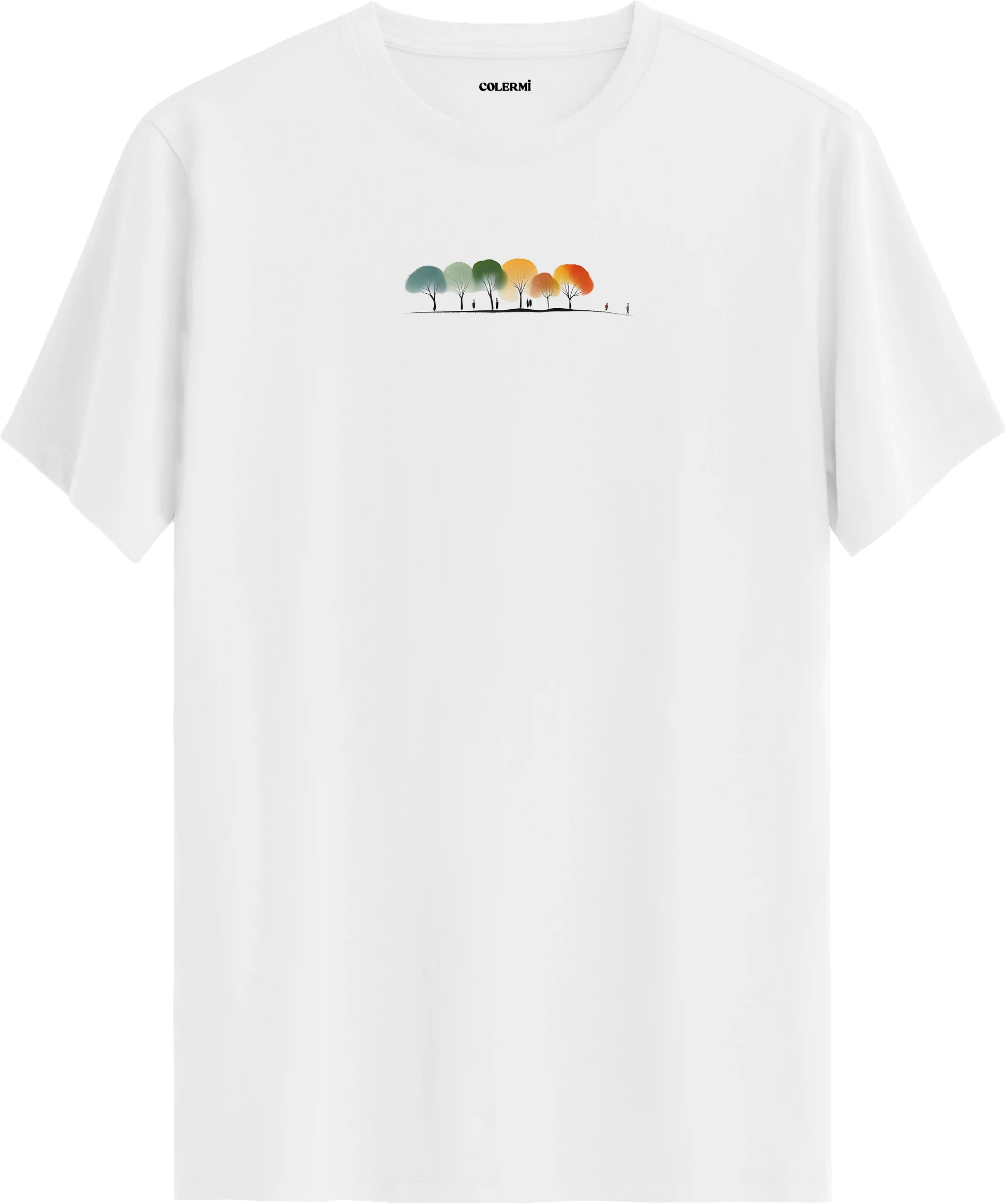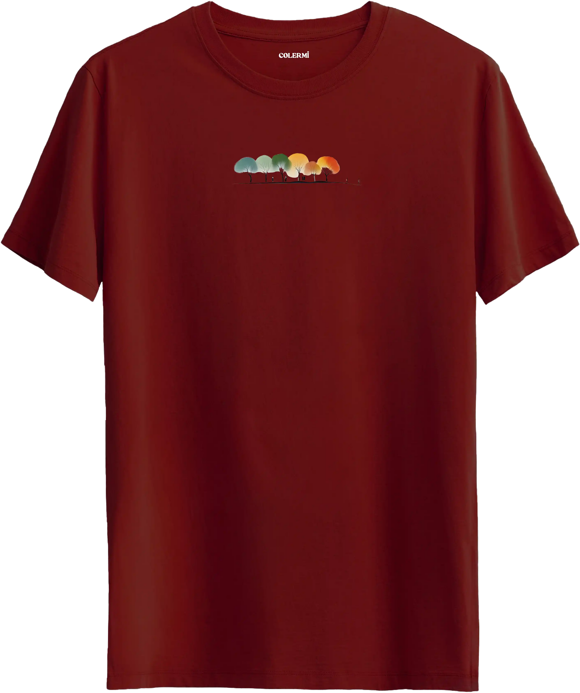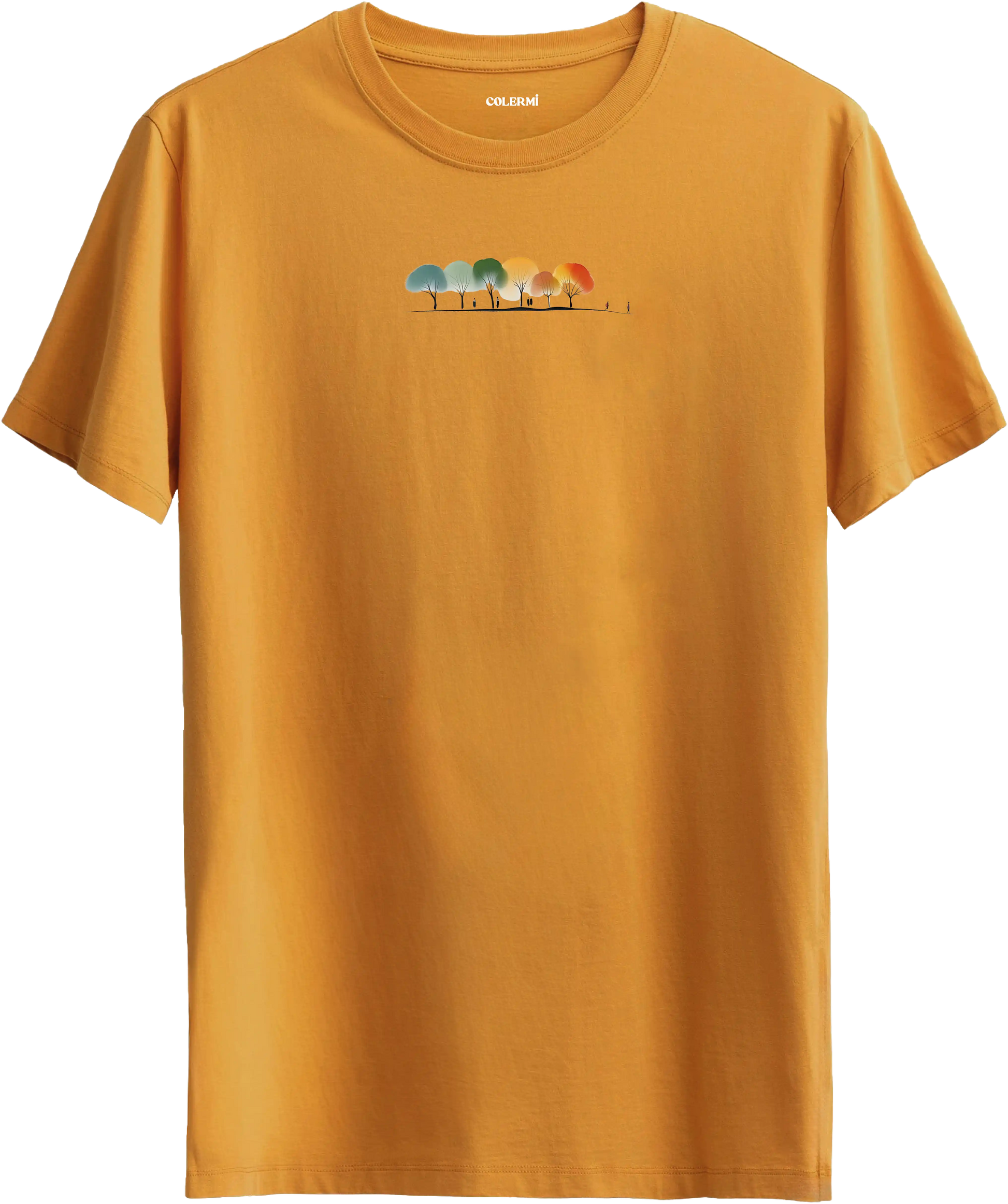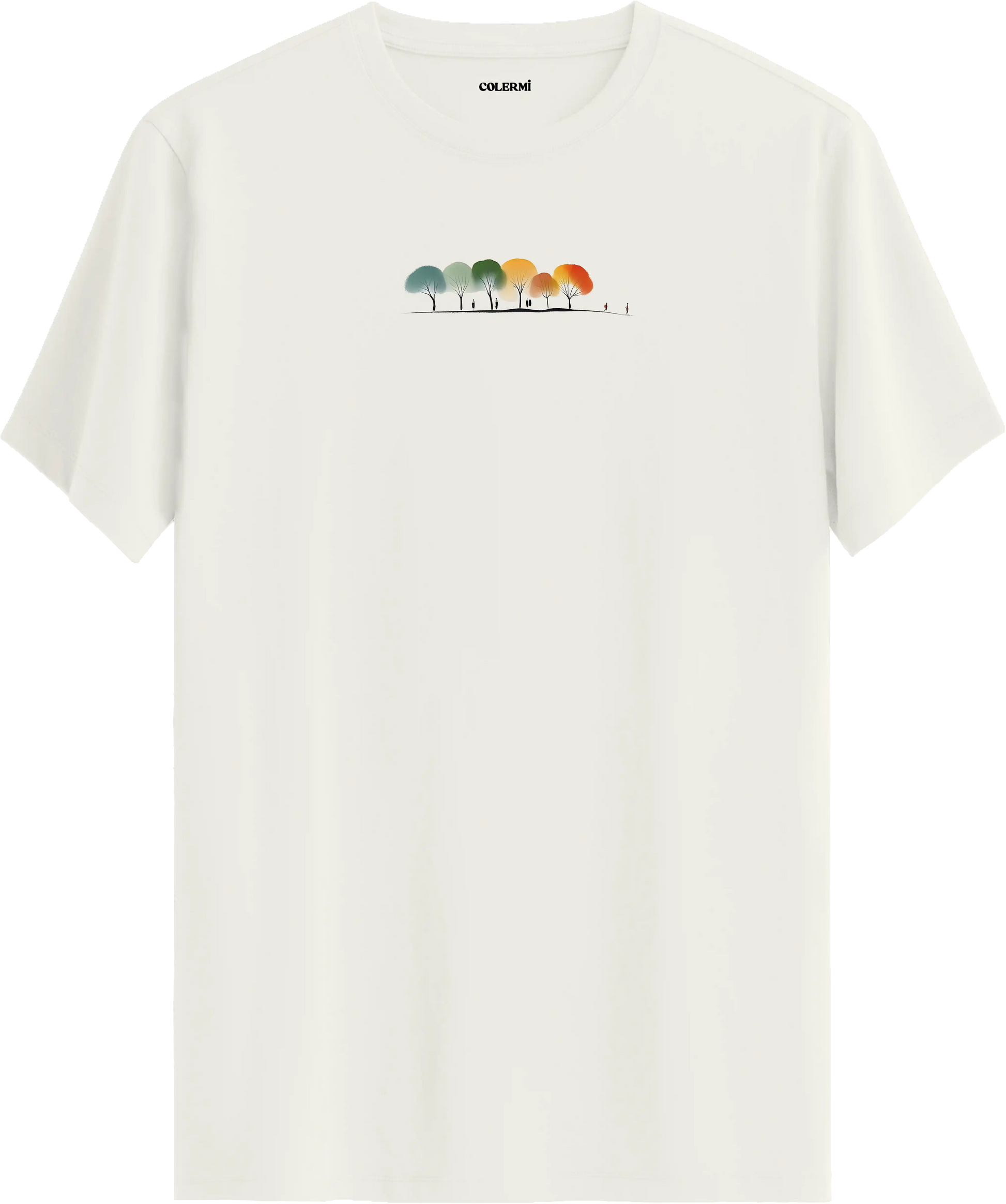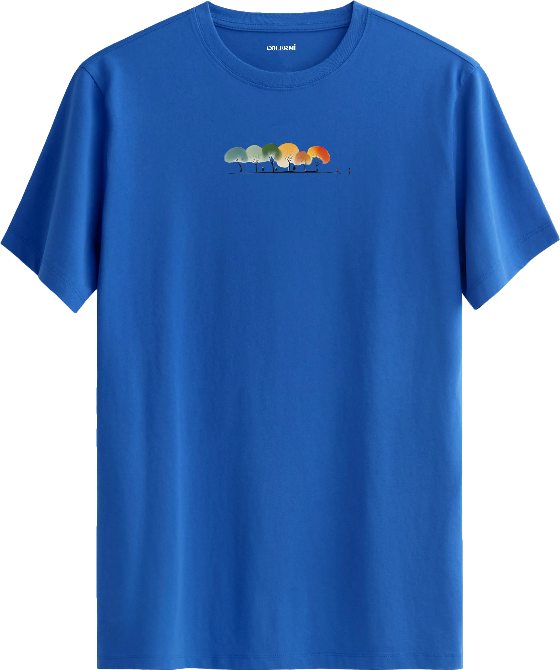Farklı tonlardaki ağaç siluetleriyle tasarlanan bu tişört, minimal stiline modern bir dokunuş katar. Günlük kombinlerde sade ama dikkat çekici bir görünüm sağlar.