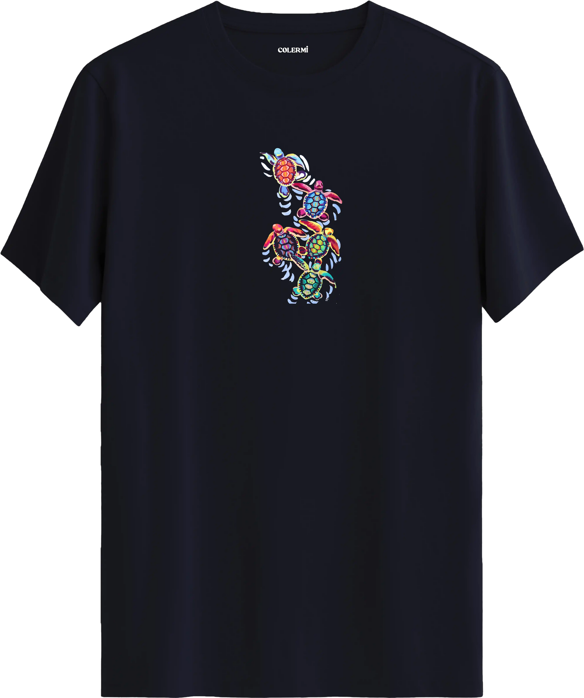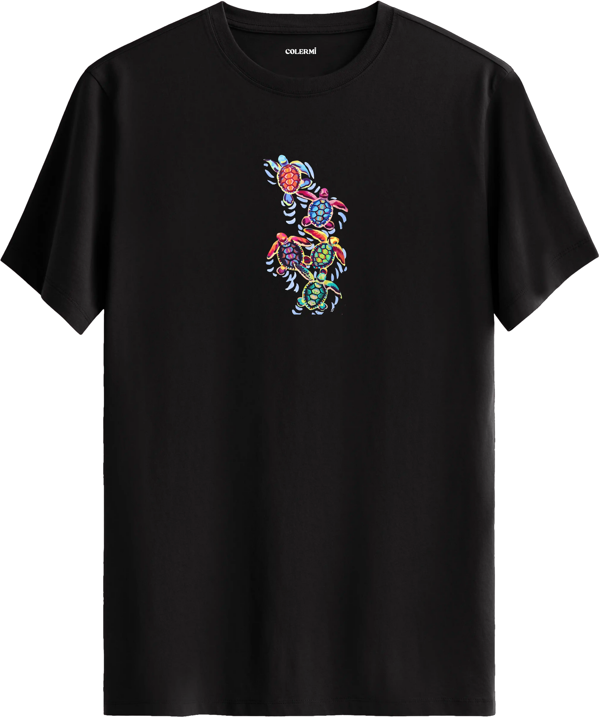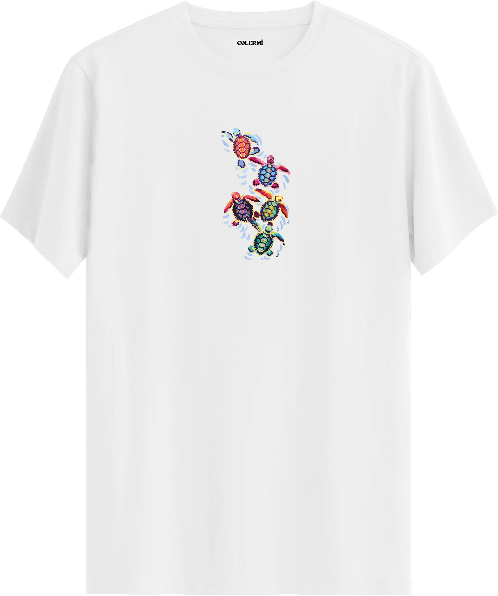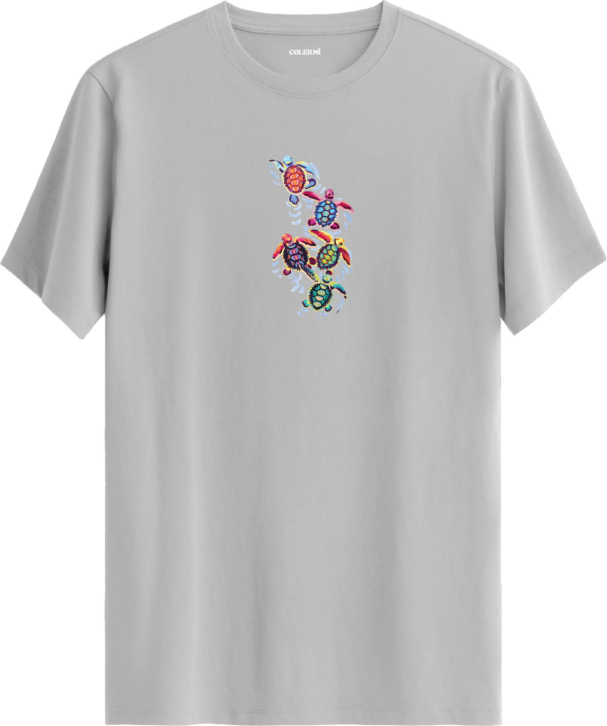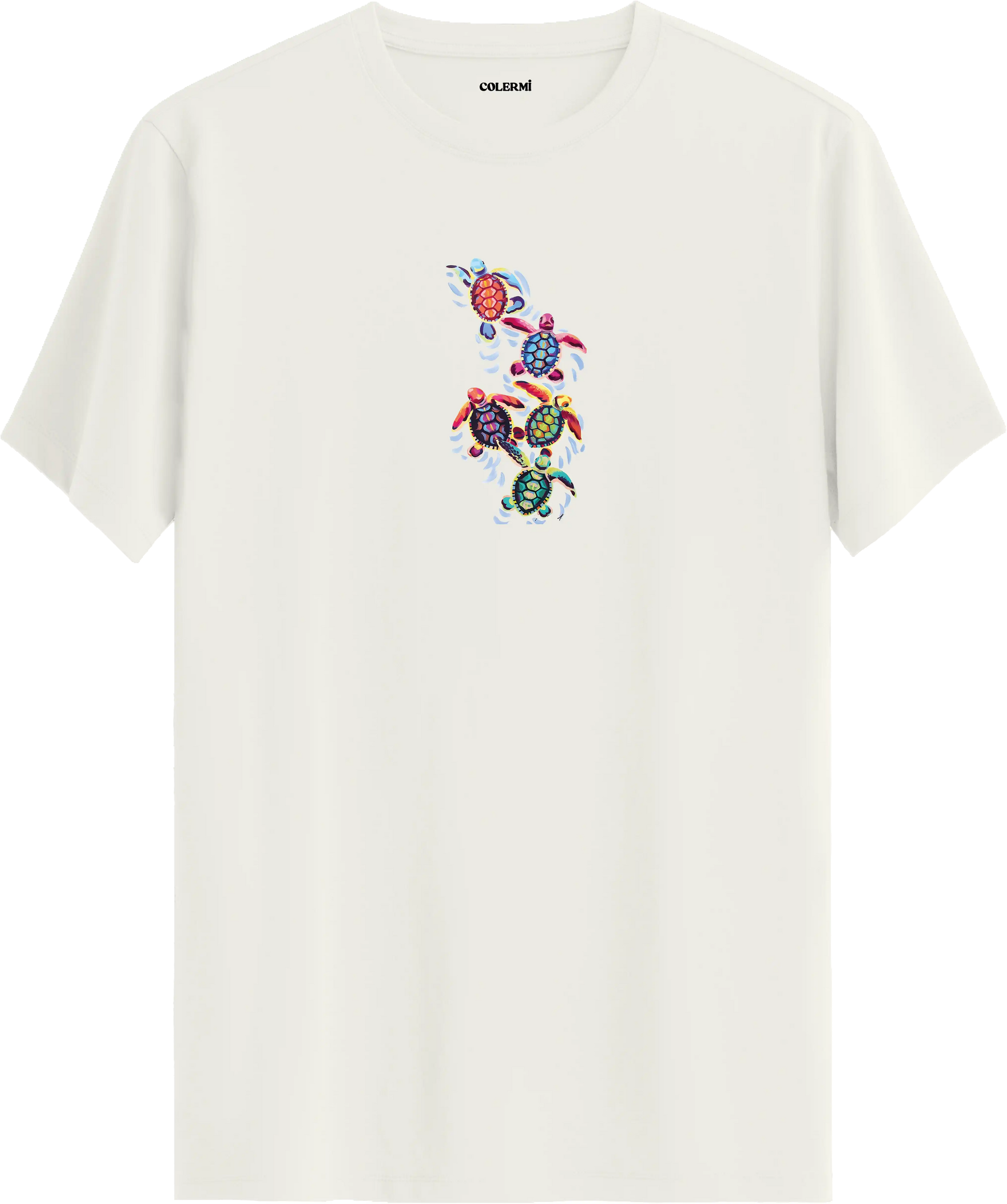 Renkli deniz kaplumbağası illüstrasyonu ile tasarlanan bu tişört, doğanın özgür ve sakin enerjisini stiline taşır. Minimal yerleşimi sayesinde sade bir görünüm sunarken, canlı renkleri ile dikkat çekici bir detay oluşturur.