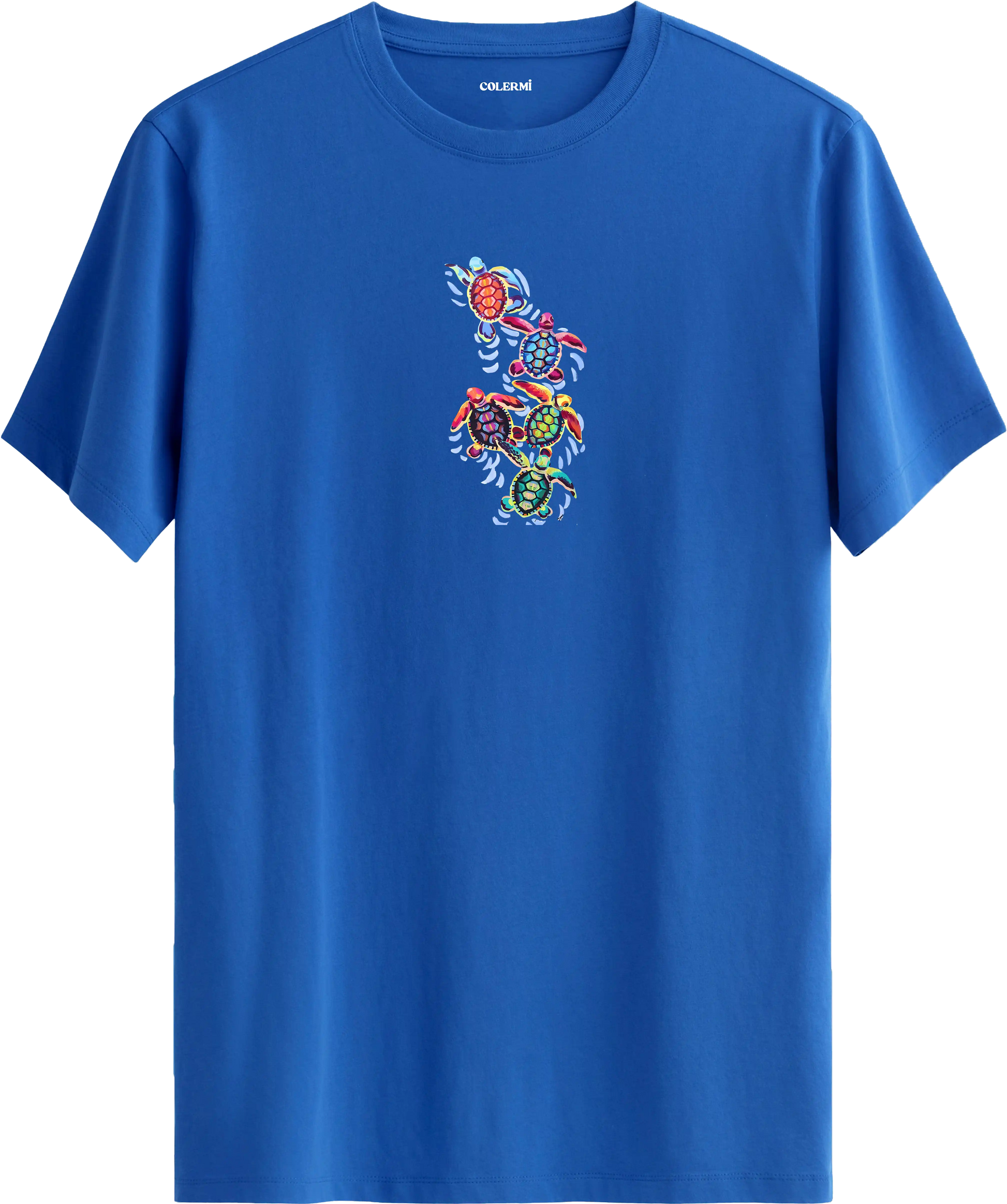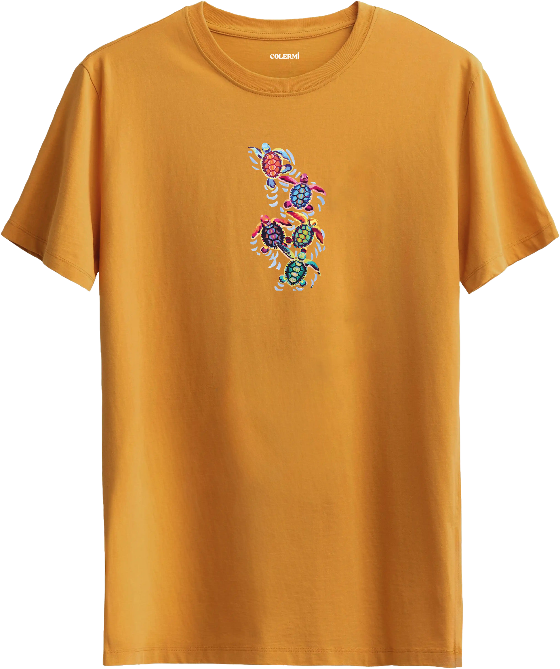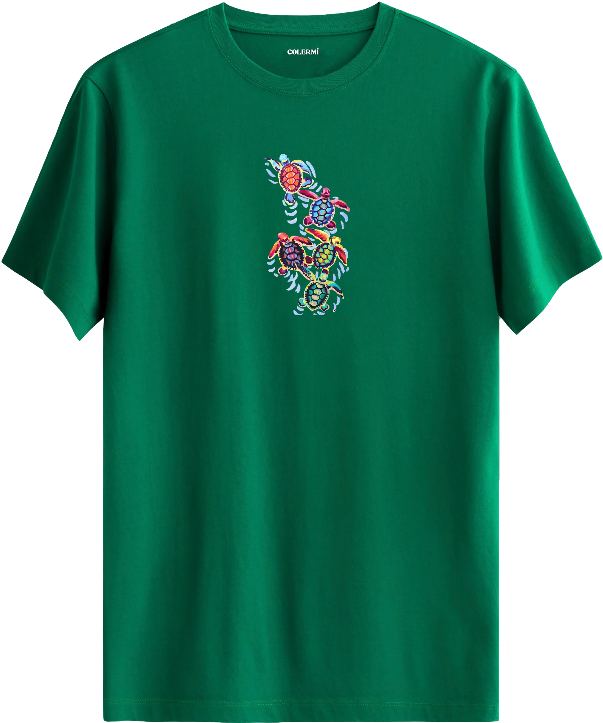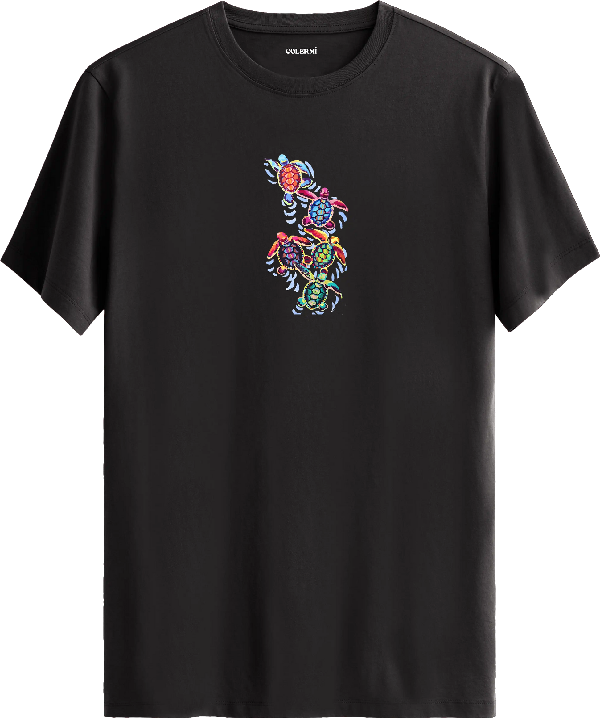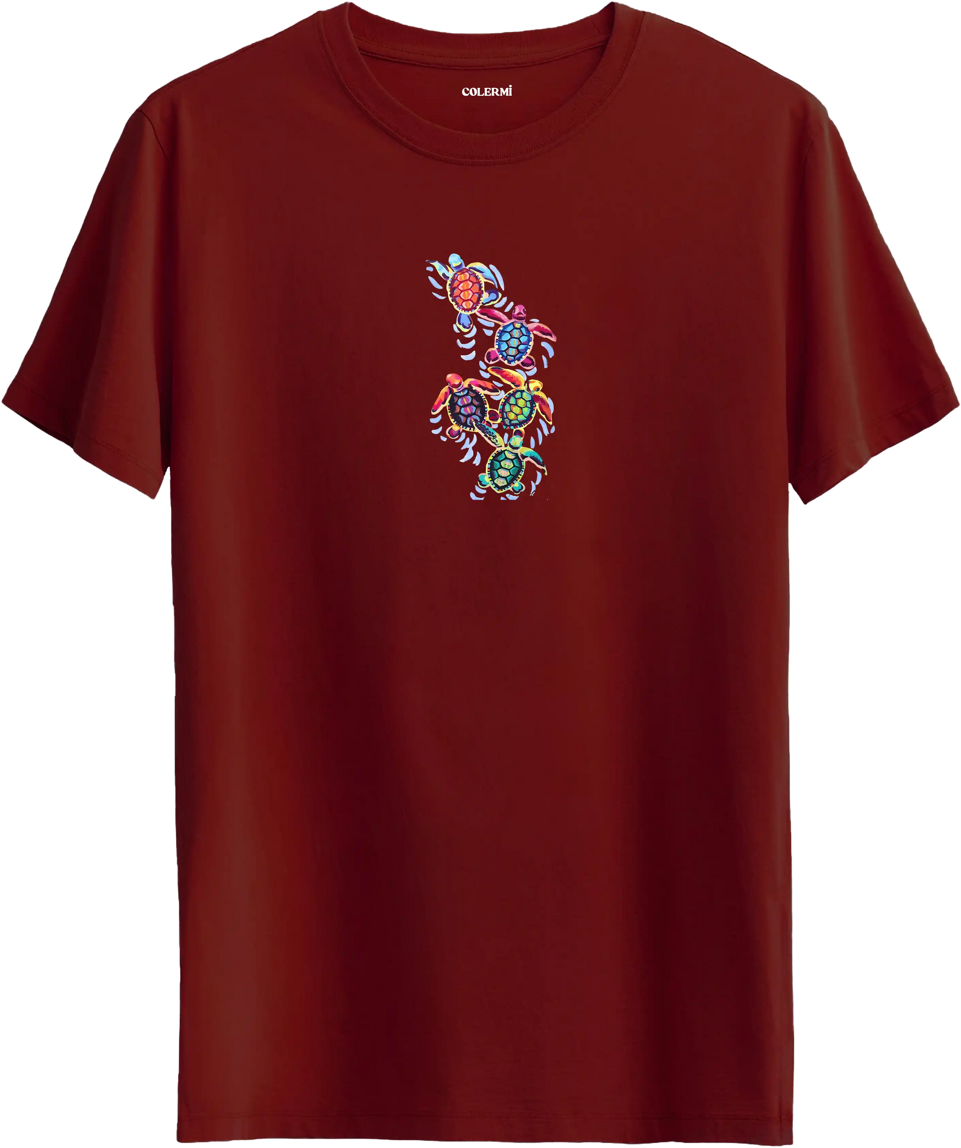 Renkli deniz kaplumbağası illüstrasyonu ile tasarlanan bu tişört, doğanın özgür ve sakin enerjisini stiline taşır. Minimal yerleşimi sayesinde sade bir görünüm sunarken, canlı renkleri ile dikkat çekici bir detay oluşturur.