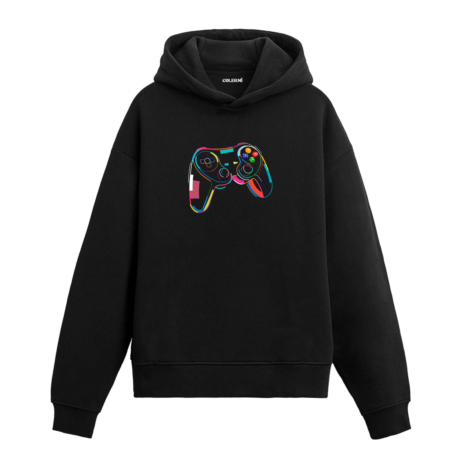 Göğüs bölümünde stilize edilmiş oyun kumandası baskısı yer alır. Dengeli kalıbı ve tok dokusuyla günlük kullanımda sakin bir rahatlık sunar. Harekete geçmeden önceki o odak anını çağrıştıran bir parçadır.