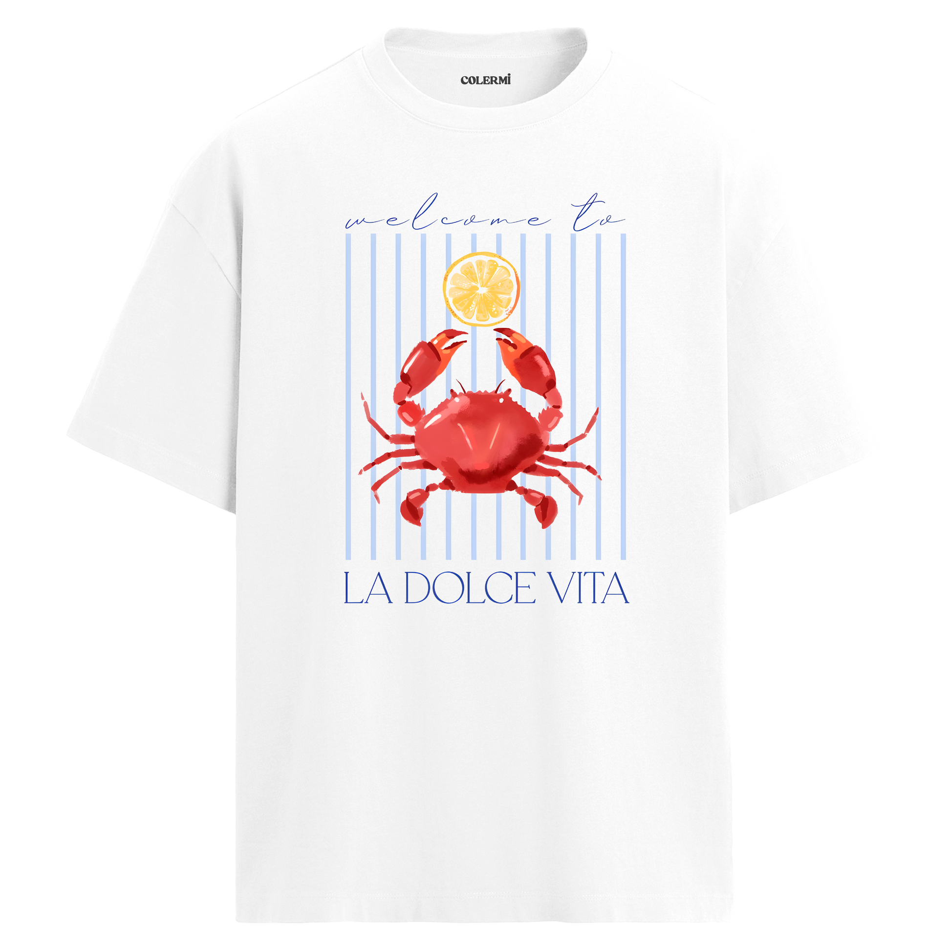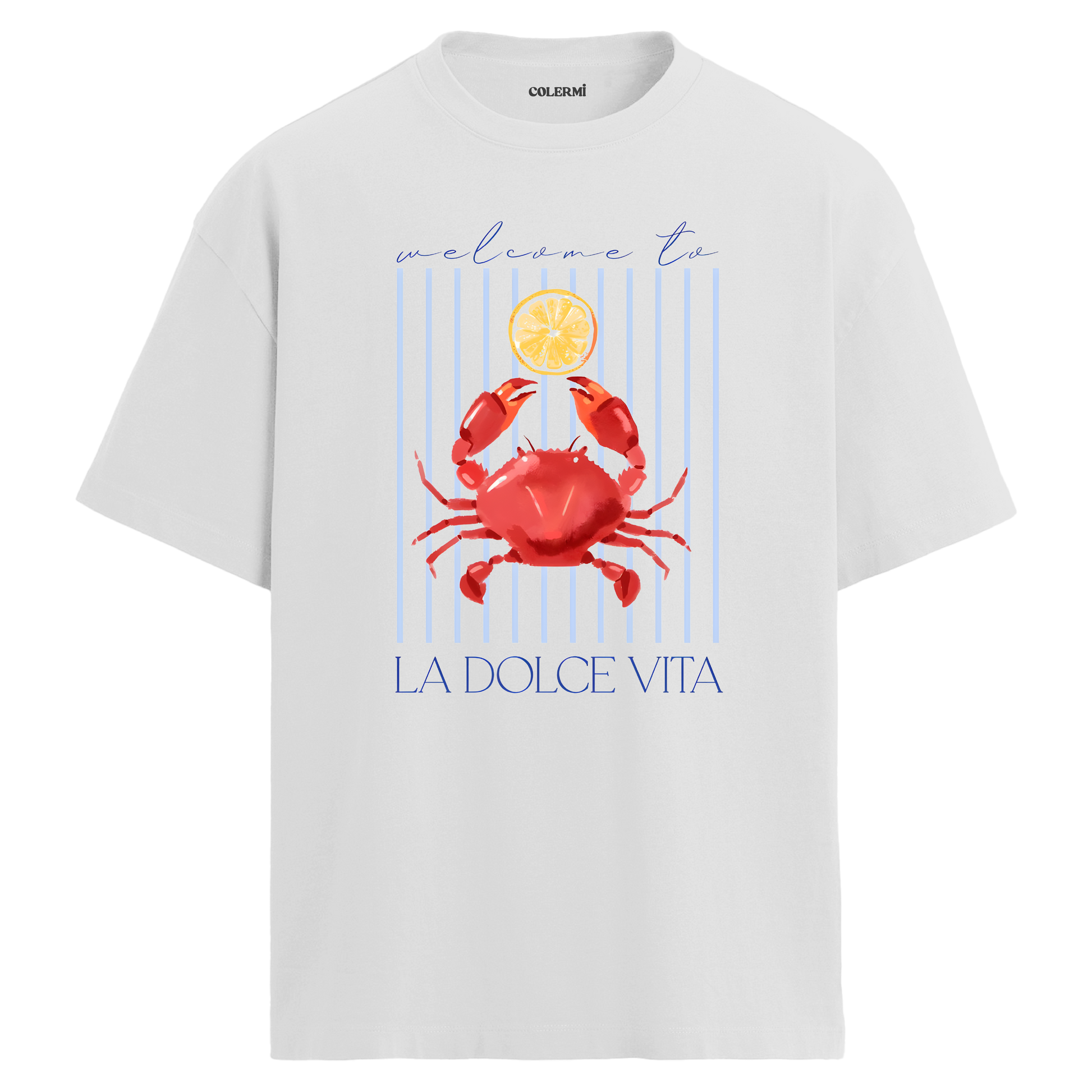 Yazın enerjisini ve Akdeniz’in ferah havasını yansıtan bu tişört, yengeç ve limon detaylarıyla dikkat çeker. Çizgili arka plan ile birleşen tasarım, sade ama karakterli bir görünüm sunar.