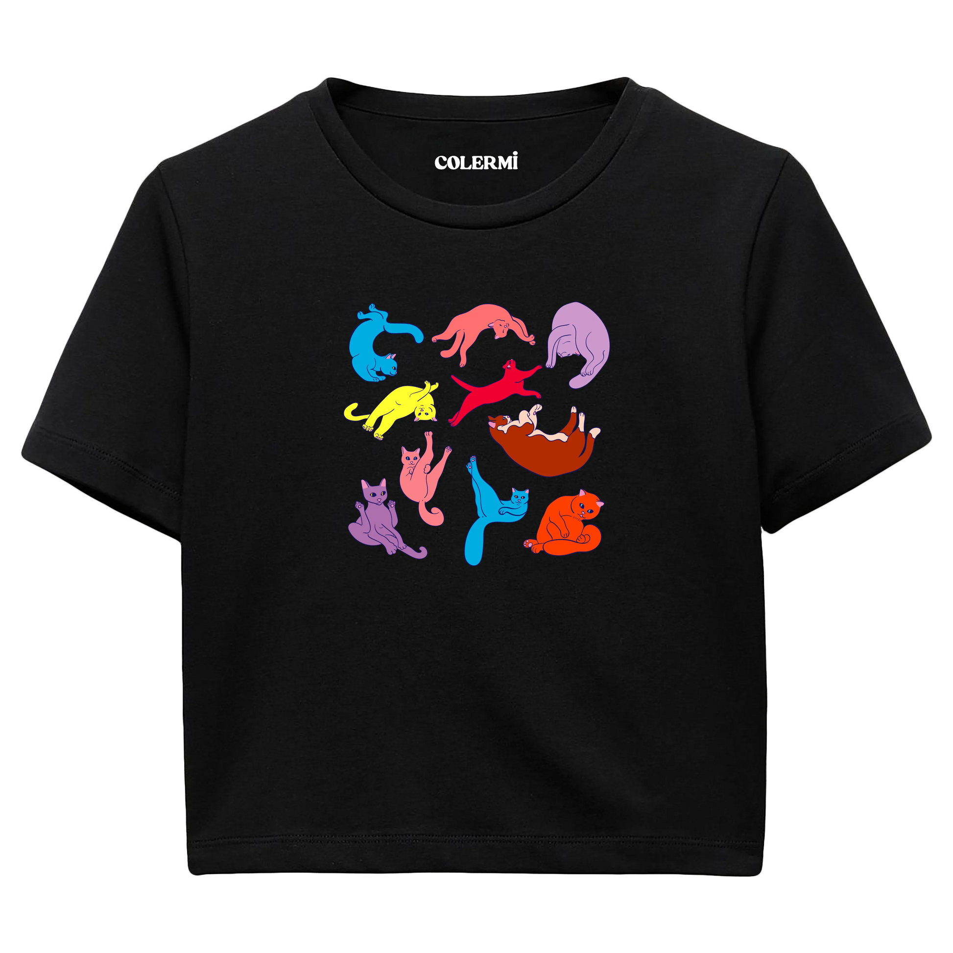Yoga Crop T-Shirt - Renkli Kedilerin Yoga Pozları